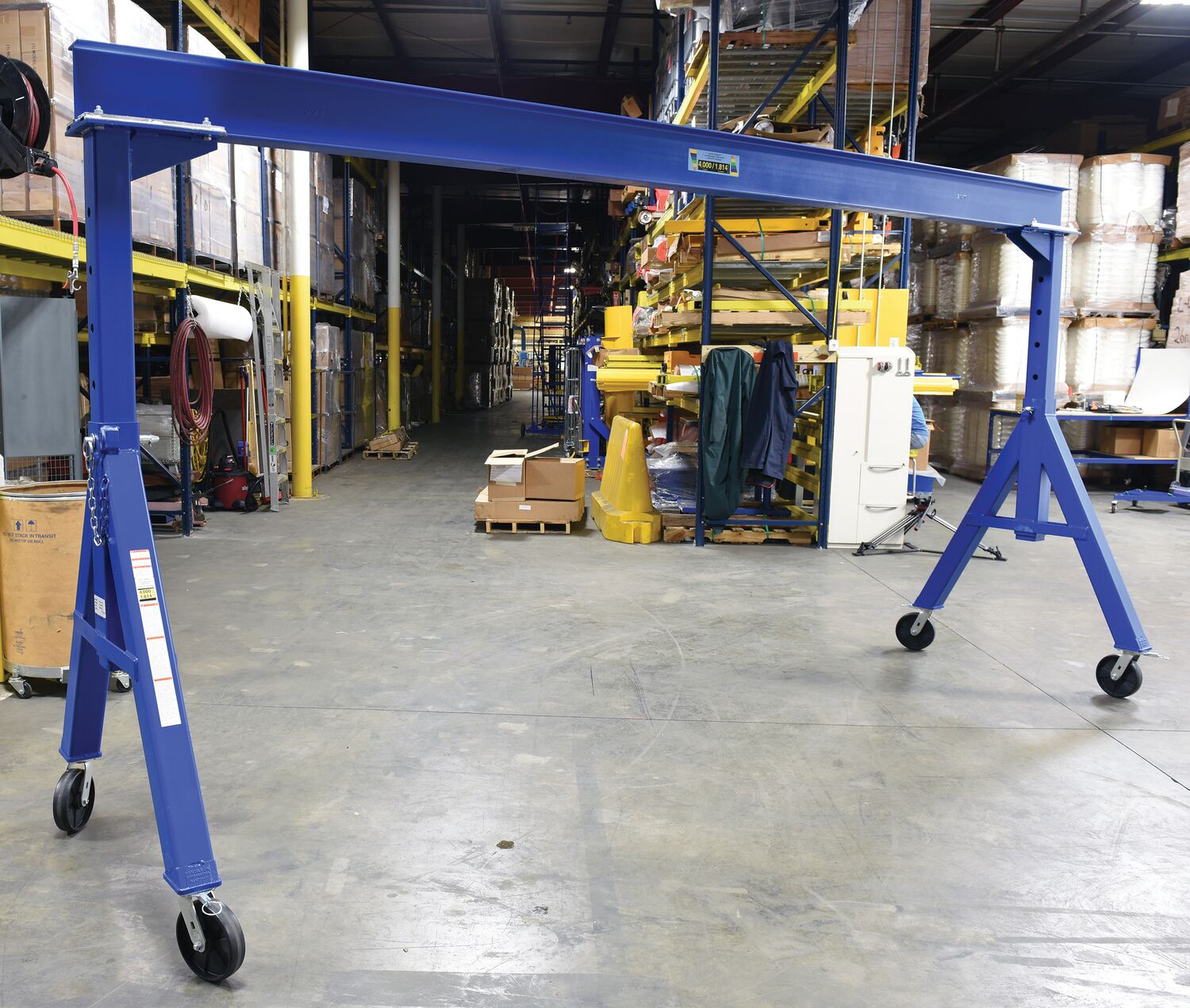 Steel Adjustable Height Gantry Crane with Phenolic Casters 15 Ft.Wide x 7 Ft. Max Usable Height 4,000 Lb. Capacity Blue