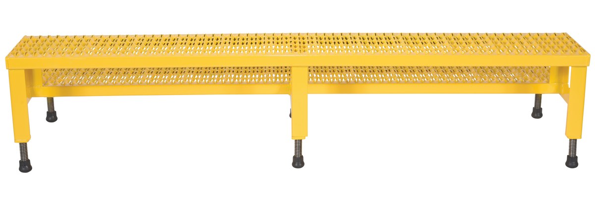The adjustable step-mate stand can be used as either a comfortable worker platform or a semi-permanent step. The serrated surface ensures safe footing. The legs adjust individually by screwing them into or out of the leg base.