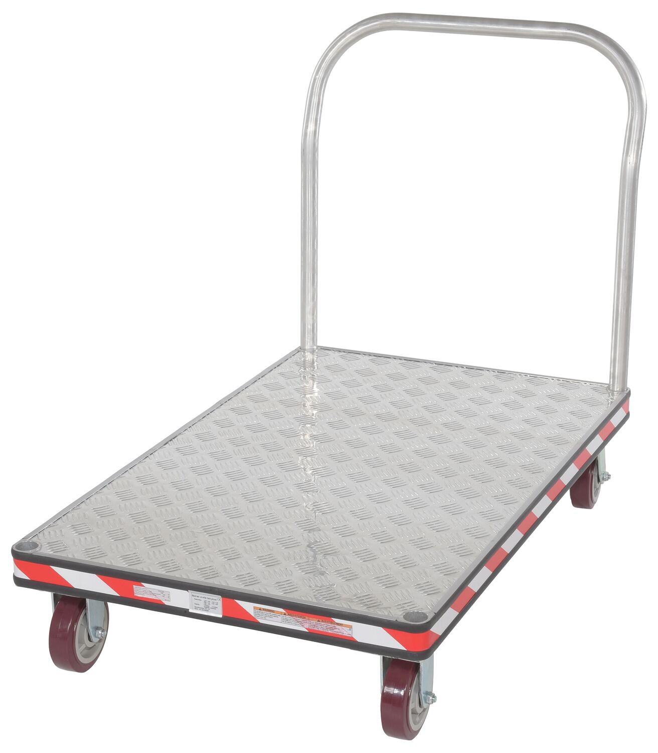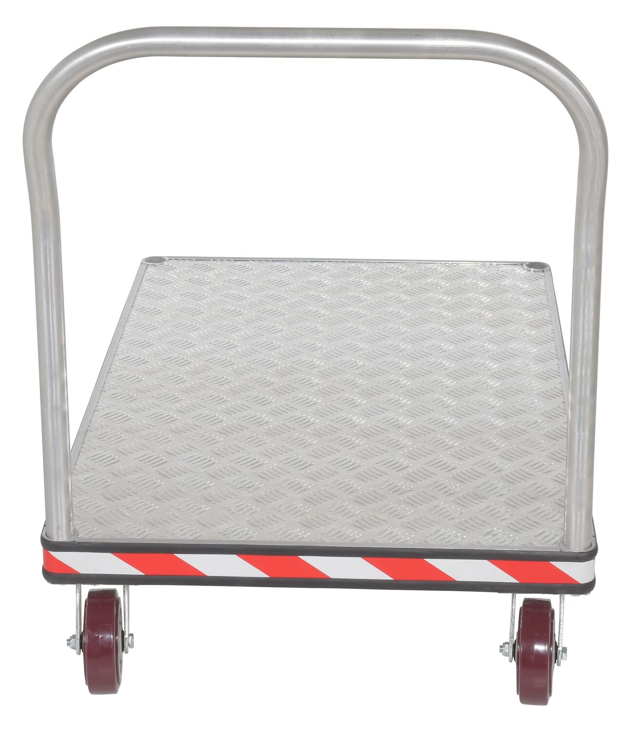 An aluminum tread plate platform truck is a great addition a variety of settings. Fitted with non-marking rubber protective buffer strip to protect walls and door frames during transit. Design allows items to be loaded and unloaded from multiple sides. The poly-on-poly casters roll smoothly over surfaces.