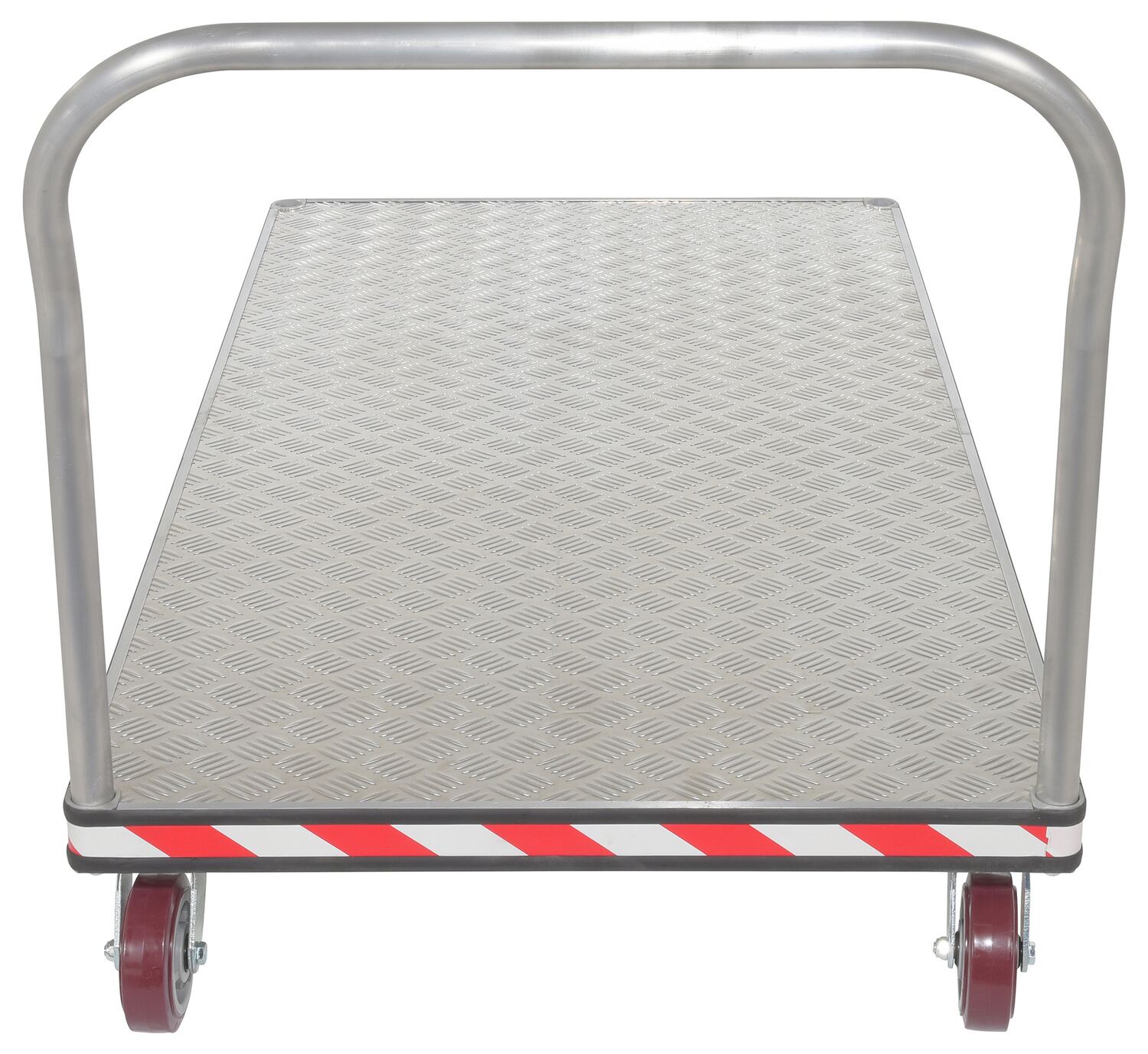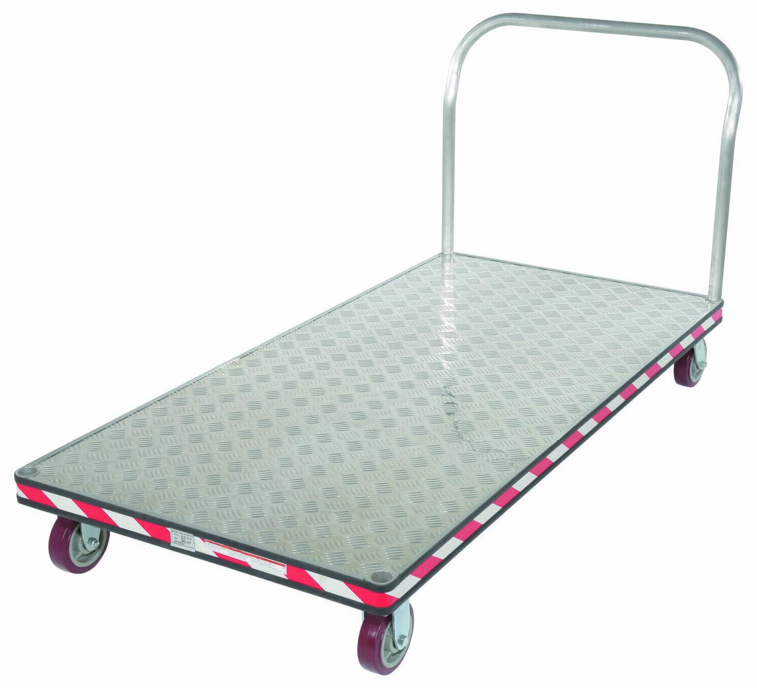 An aluminum tread plate platform truck is a great addition a variety of settings. Fitted with non-marking rubber protective buffer strip to protect walls and door frames during transit. Design allows items to be loaded and unloaded from multiple sides. The poly-on-poly casters roll smoothly over surfaces.