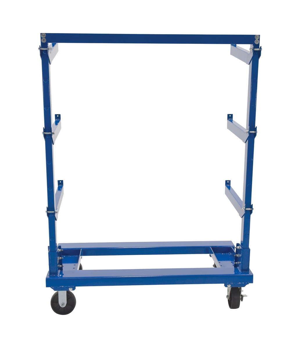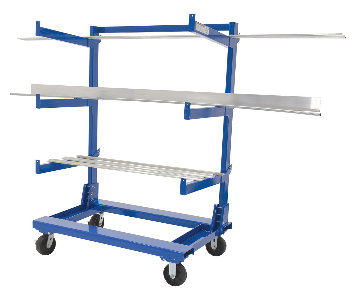 A portable Cantilever cart is for storage of bar stock type items. Cart includes three (3) pairs of arms, secured to the cart with a bolt and nut. Arm height is adjustable in six (6) inch increments and can be mounted at an incline or straight. The base includes built in fork pockets. Unit rolls on casters and is all steel construction with blue powder-coat finish.