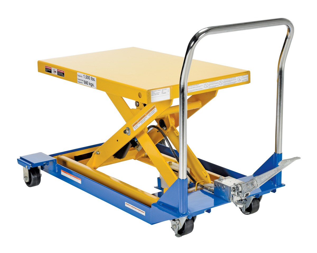 Steel Foot Pump Scissor Cart 36 In. x 24 In. 1500 Lb. Capacity Blue / YellowThe manually powered Scissor Cart table provides an unparalleled support in lifting, palletizing, loading, and unloading applications. The cart is raised or lowered with a manual two-speed foot pump. The unit rolls smoothly on two rigid and two swivel phenolic casters with brakes. The push handle is removable. Features an internal safety velocity fuse in each cylinder.