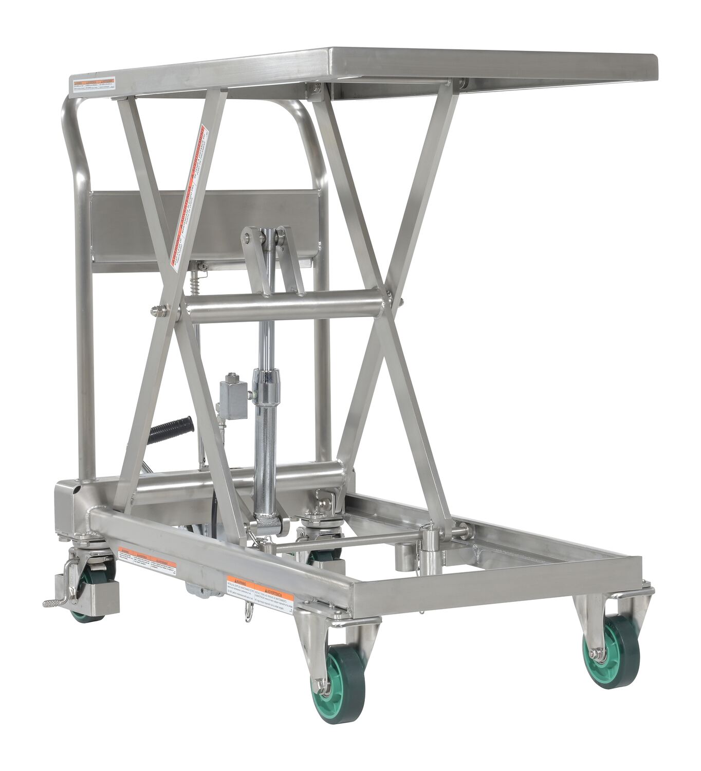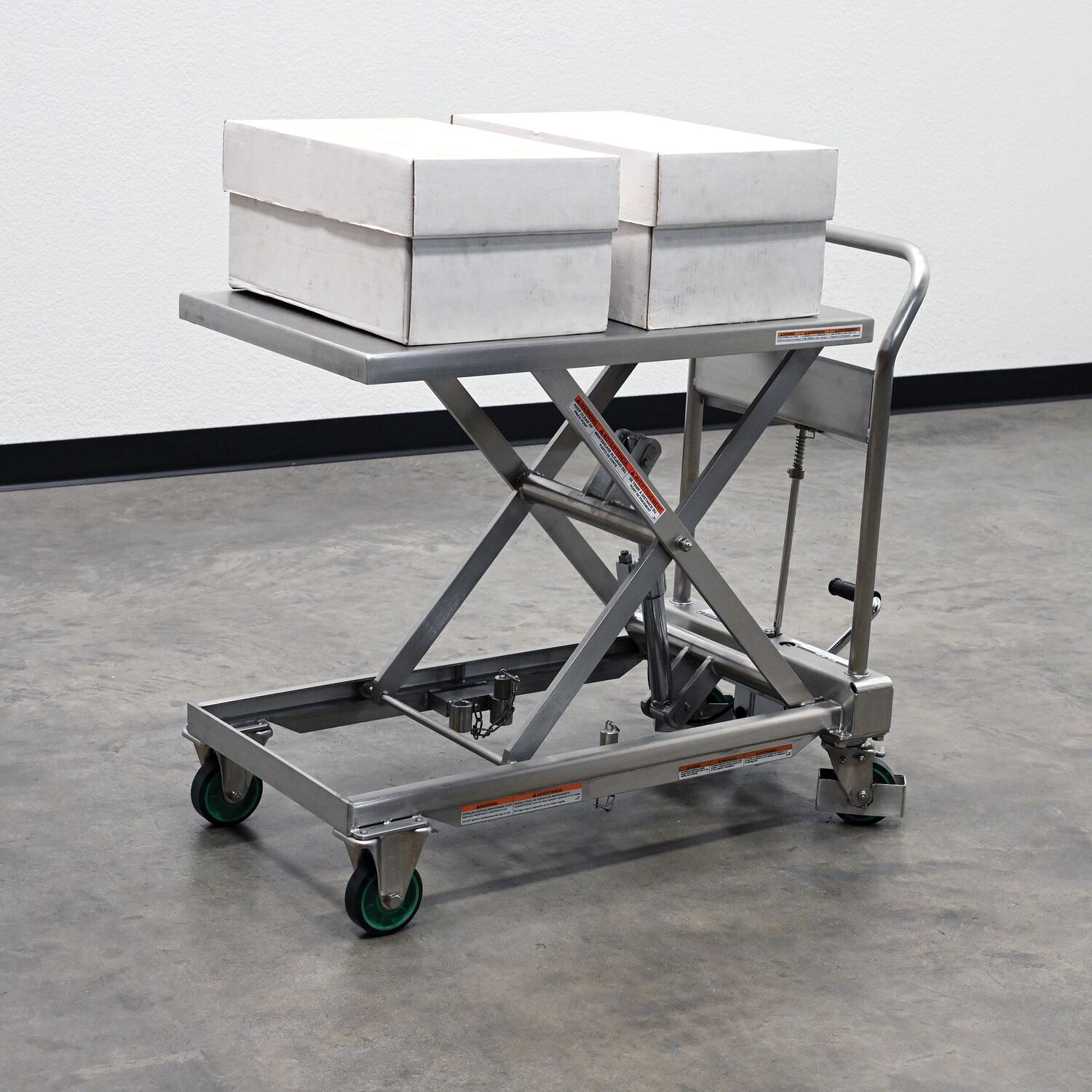 Stainless Steel Hydraulic Cart 19-1/2 In. x 31-1/2 In. 550 Lb. Capacity SilverThe Hydraulic elevating cart minimizes worker bending and lifting through its ergonomic design and portability. Material can be easily loaded onto a cart from a table, lowered to a safe transporting height, and raised to unload at destination. The foot pump includes a soft-lowering down valve. The unit moves easily on four polyurethane casters; two swivel with brakes and two rigid. Features a two-speed foot pump. Foot pump pedal, pump assembly and hydraulic cylinder are chrome plated. Rest of the unit is fully stainless construction. Features an internal safety velocity fuse in each cylinder.