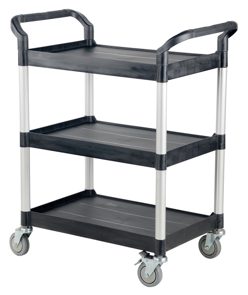 Steel Commercial Cart 3 Shelves and No Panels 43 In. x 20 In. 550 Lb. Capacity BlackThe food and service cart is ideal for the hospitality industry. The secure grip handles on the strong, yet, lightweight frame makes for easy maneuverability, while the low noise thermoplastic casters make transportation as quiet as possible. The steel constructed panels and slider drawer protects.
