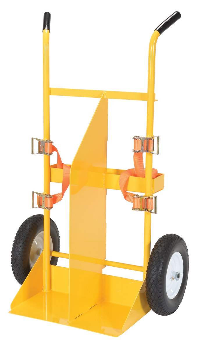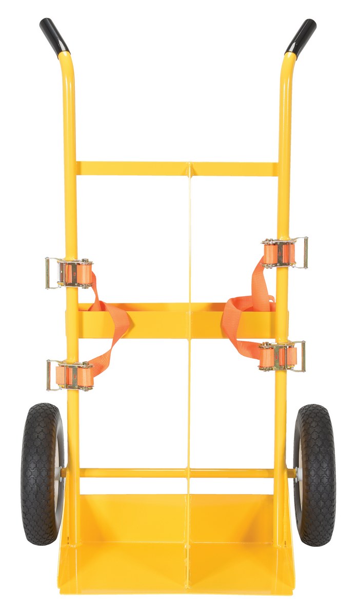 Steel Cylinder Torch Cart with Foam Filled Wheels 22-13/16 In. x 34-1/2 In. x 57 In. 500 Lb. Capacity YellowThe welding Cylinder torch cart is designed for transporting cylinders and cutting torch. Includes two (2) tank compartments with heavy-duty ratchet straps. Convenient open-top storage tray. Sturdy handles and large wheels for tilt-n-go portability. Welded steel construction with powder coat finish. Not designed for use as a storage means for gas cylinders.