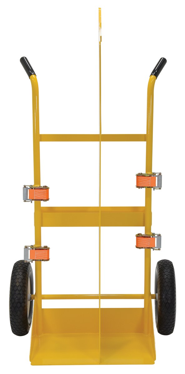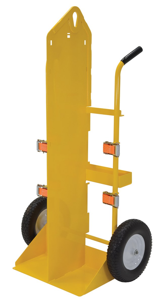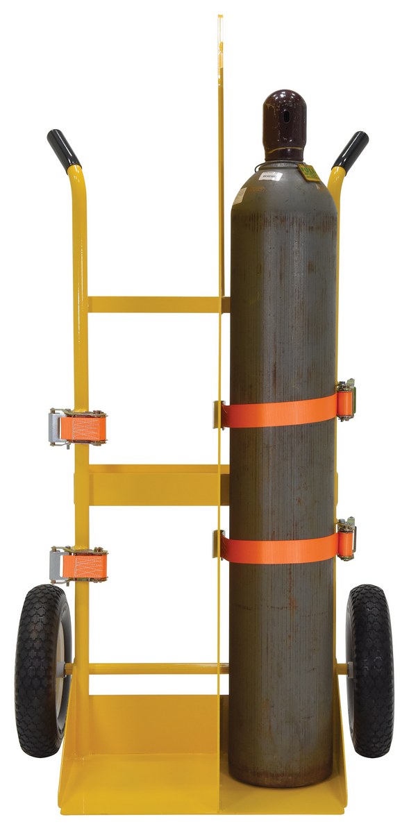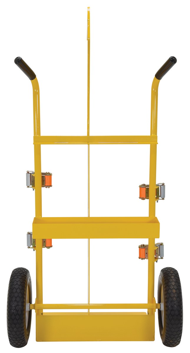 Steel Torch Cart-Lift Eye with Foam Filled Wheels 22-13/16 In. x 34-1/2 In. x 66-3/8 In. 500 Lb. Capacity YellowThe welding Cylinder torch cart is designed for transporting cylinders and cutting torch. Includes two (2) tank compartments with heavy-duty ratchet straps. Convenient open-top storage tray. Sturdy handles and large wheels for tilt-n-go portability. Welded steel construction with powder coat finish. Not designed for use as a storage means for gas cylinders.