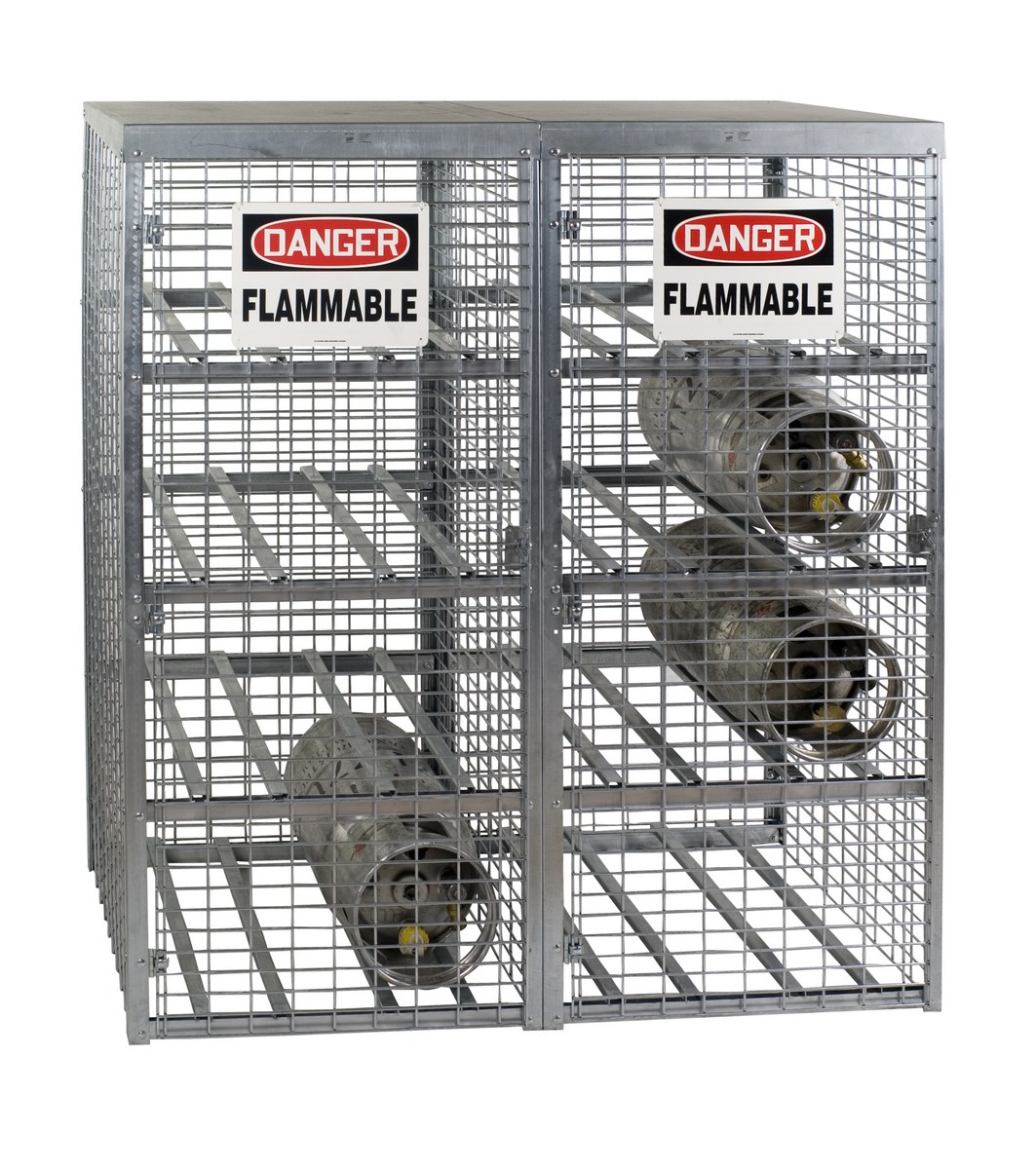 Store LP tanks horizontally and acetylene tanks vertically in this heavy-duty Galvanized Cylinder storage cabinet. Made of all steel construction, this rust resistant cabinet has galvanized welded wire sides with sturdy square steel angle frames and a durable galvanized steel roof. The galvanized rust resistant finish stands up to harsh outdoor environments. Features a "danger flammable materials" sign, and all necessary hardware. Meets OSHA requirements.