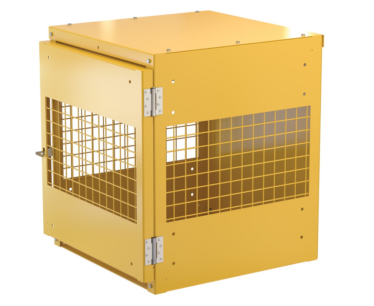 Steel cabinets for storage of cylinders. Cylinder storage capacity is based on cylinder size. Sides and door are made of expanded steel, and the bottom, back, and top are mode of solid sheet steel. Lockable doors protect cylinders (padlock not included). Base includes lag holes for securing cabinets. Chains for securing cylinders are included. Meets OSHA sec. 1910.110 (f )(6)(ii), ANSI NFPA 55 + 58, and CGA P-1 design standards. Rugged steel construction with safety yellow baked-in powder-coated toughness. This cabinet is shipped knock down and requires user assembly.