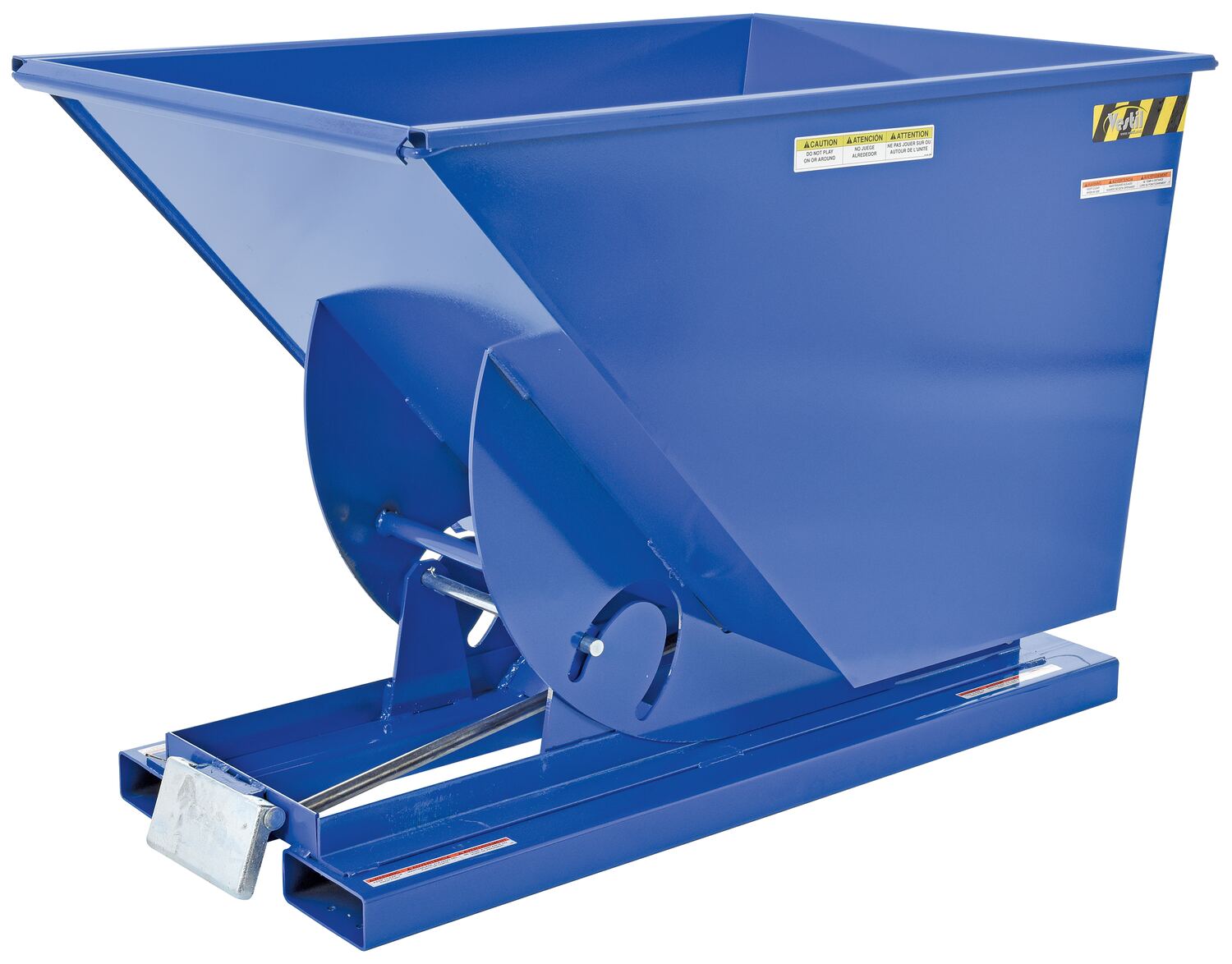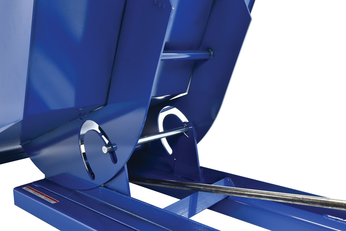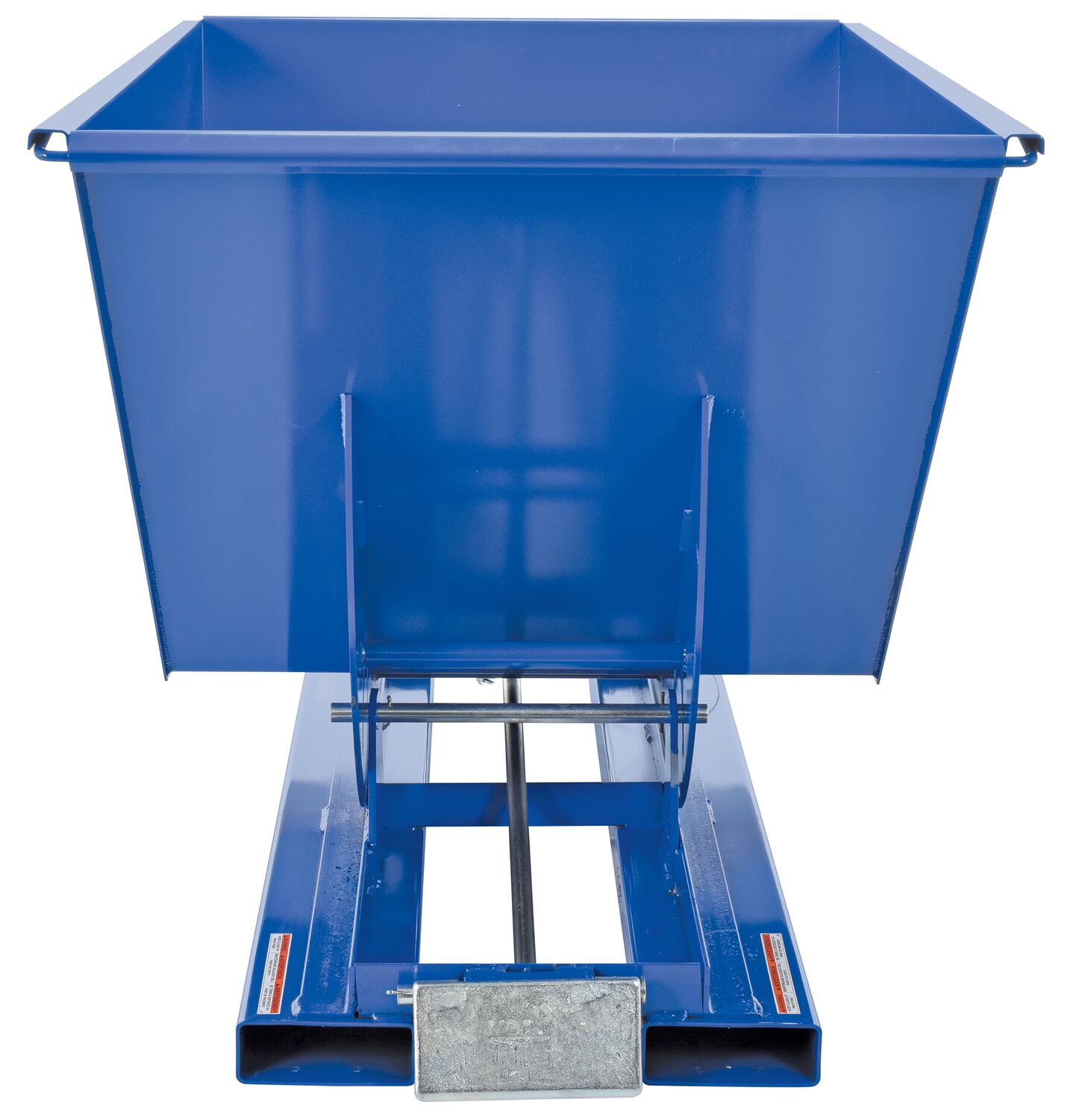 Steel Heavy Duty Self Dumping Hopper 1 Cubic Yard 6000 Lb. Capacity BlueThis Heavy Duty self-dumping steel Hopper with bumper release automatically dumps when bumper release contacts the front of the dumpster. Hopper returns to an upright and locked position automatically after it dumps. Also includes a cable that may be operated from the seat of the fork truck to manually dump the hopper. The included safety restraint should be properly secured to a fork truck before dumping. (Length dimension is measured at top of chute.) Hopper is stackable if you stack the top hopper turned ninety (90) degrees from the bottom. Self-dumping hoppers facilitate compliance with OSHA general industry rule 29 CFR 1910.178(m)(5)(iii) by allowing lift truck operators to remain at the controls of their truck throughout the dumping process.