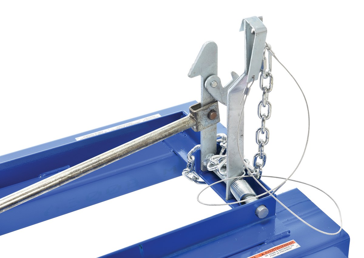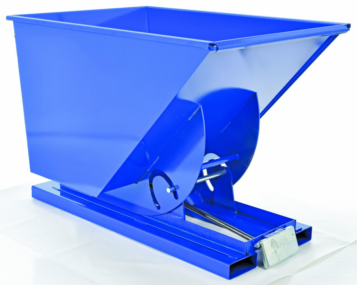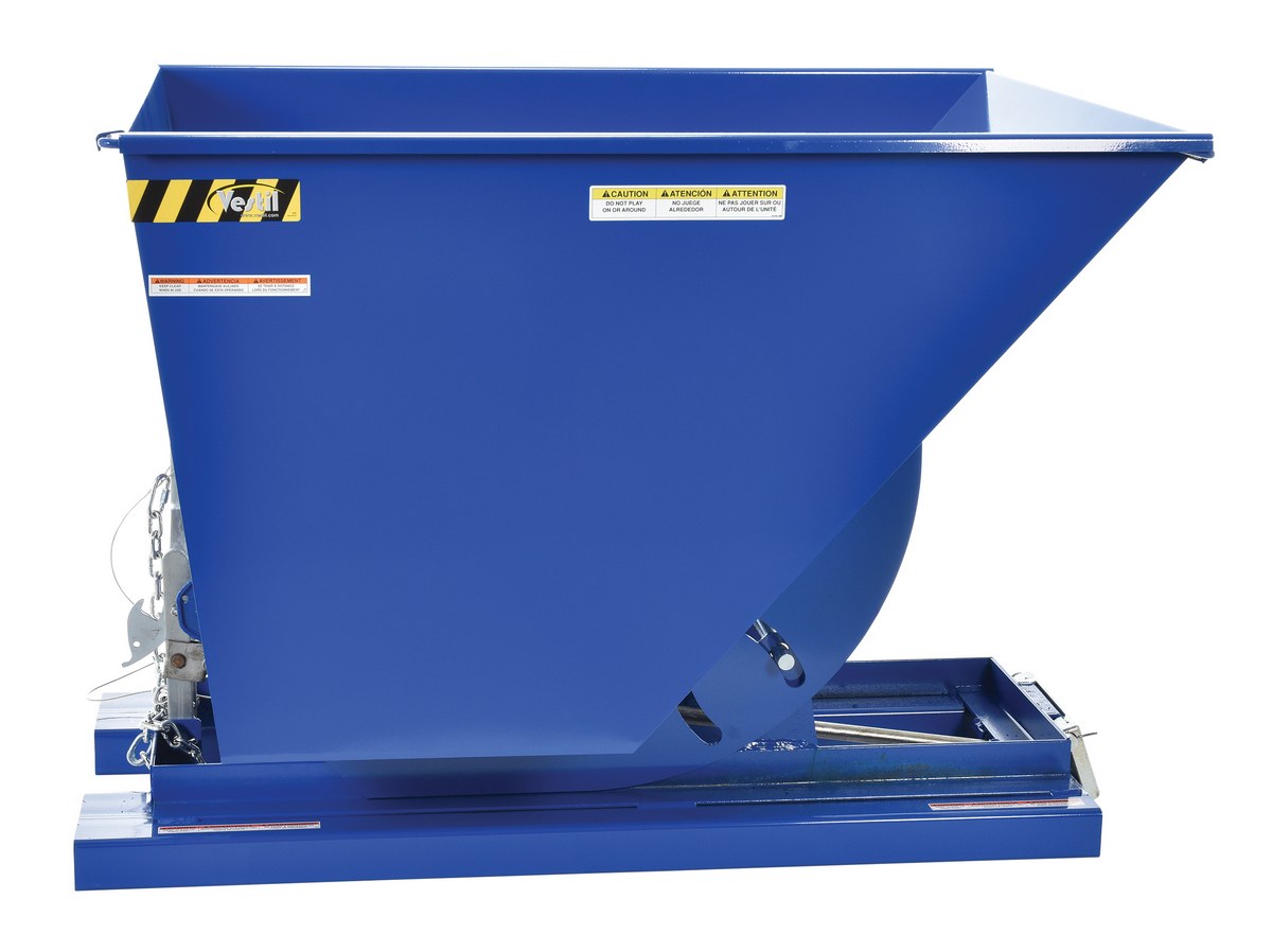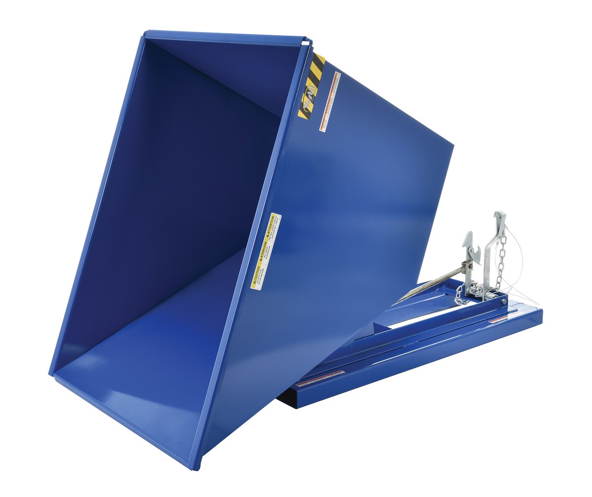 Steel Heavy Duty Self Dumping Hopper 1 Cubic Yard 6000 Lb. Capacity BlueThis Heavy Duty self-dumping steel Hopper with bumper release automatically dumps when bumper release contacts the front of the dumpster. Hopper returns to an upright and locked position automatically after it dumps. Also includes a cable that may be operated from the seat of the fork truck to manually dump the hopper. The included safety restraint should be properly secured to a fork truck before dumping. (Length dimension is measured at top of chute.) Hopper is stackable if you stack the top hopper turned ninety (90) degrees from the bottom. Self-dumping hoppers facilitate compliance with OSHA general industry rule 29 CFR 1910.178(m)(5)(iii) by allowing lift truck operators to remain at the controls of their truck throughout the dumping process.