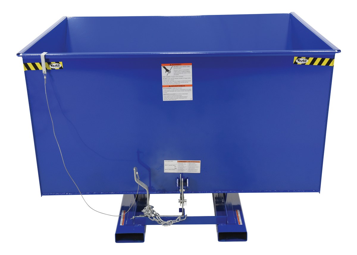This Light Duty self-dumping steel Hopper with bumper release automatically dumps when bumper release contacts the front of the dumpster. Hopper returns to an upright and locked position automatically after it dumps. Also includes a cable that may be operated from the seat of the fork truck to manually dump the hopper. The included safety restraint should be properly secured to a fork truck before dumping. (Length dimension is measured at top of chute.) Self-dumping hoppers facilitate compliance with OSHA general industry rule 29 CFR 1910.178(m)(5)(iii) by allowing lift truck operators to remain at the controls of their truck throughout the dumping process.