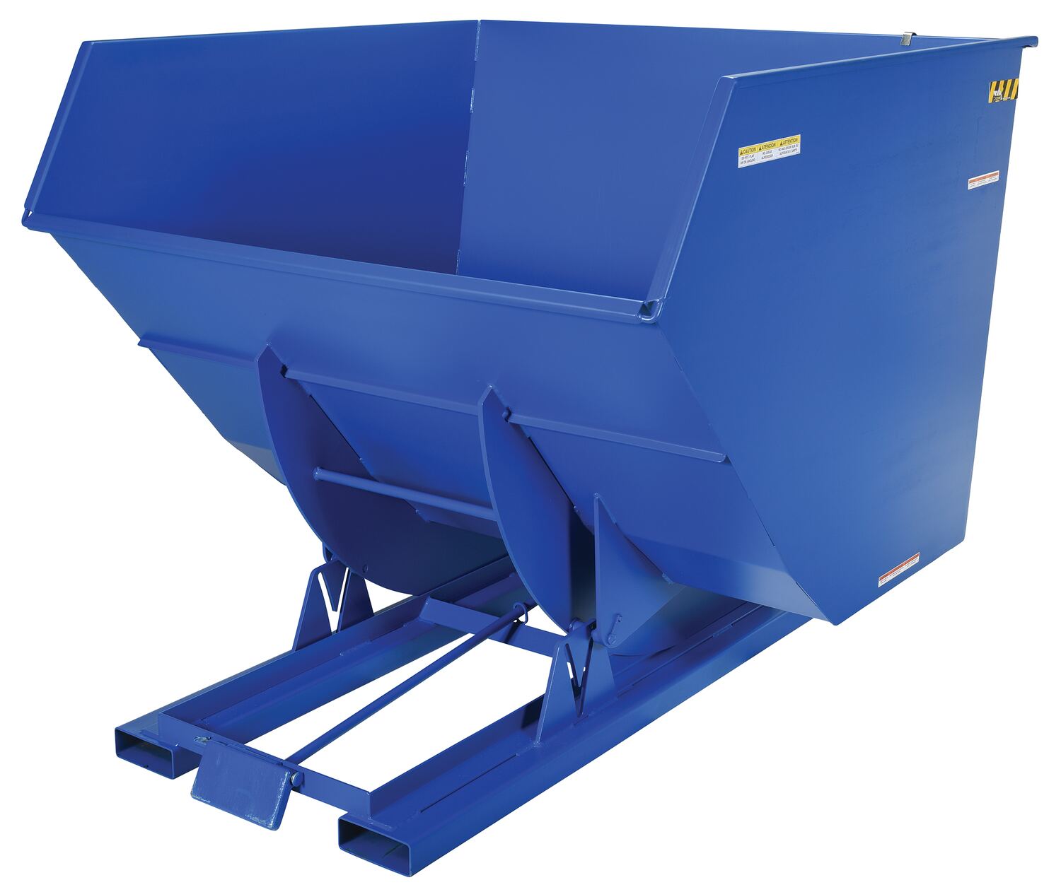 Steel Heavy Duty Self Dumping Hopper 4 Cubic Yard 6000 Lb. Capacity BlueThe self- dumping Hopper is ideal for discarding material products. The blue powder coated steel construction is durable and long lasting through the toughest of environments. Additional features include; an automatic return to the upright position, full length fork tubes for easy portability, a safety chain restraint for secure transporting while on fork lift, and a manual pull cable for dumping from the driving position, as well as, a front hopper release. Self-dumping hoppers facilitate compliance with OSHA general industry rule 29 CFR 1910.178(m)(5)(iii) by allowing lift truck operators to remain at the controls of their truck throughout the dumping process.