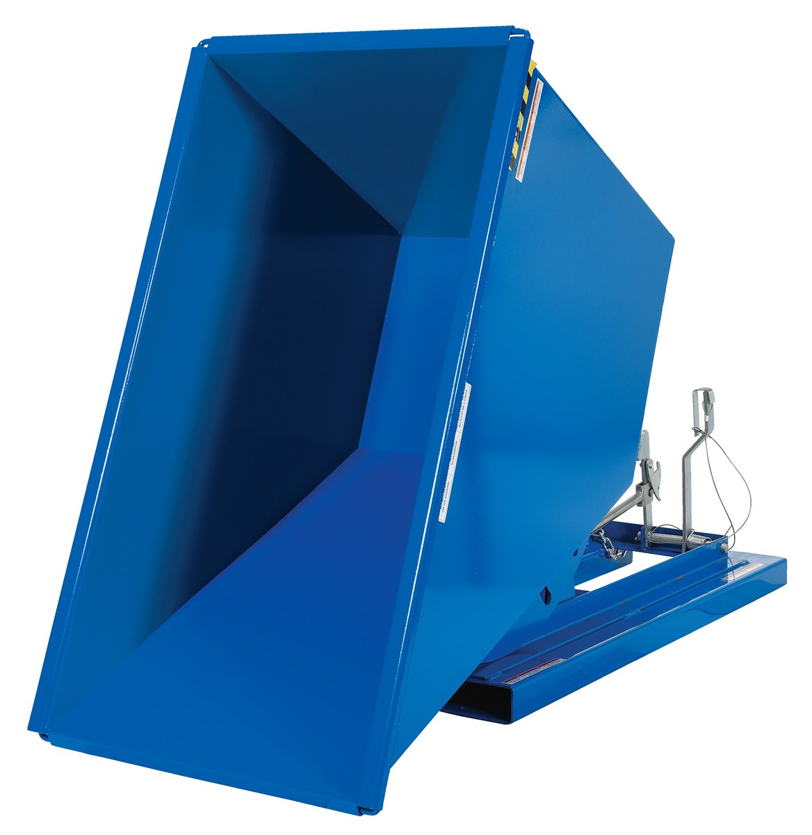 This Light Duty self-dumping steel Hopper with bumper release automatically dumps when bumper release contacts the front of the dumpster. Hopper returns to an upright and locked position automatically after it dumps. Also includes a cable that may be operated from the seat of the fork truck to manually dump the hopper. The included safety restraint should be properly secured to a fork truck before dumping. (Length dimension is measured at top of chute.) Hopper is stackable if you stack the top hopper turned ninety (90) degrees from the bottom. Self-dumping hoppers facilitate compliance with OSHA general industry rule 29 CFR 1910.178(m)(5)(iii) by allowing lift truck operators to remain at the controls of their truck throughout the dumping process.