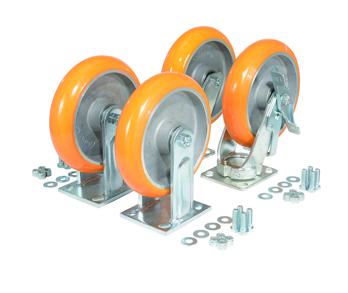 Polyurethane Caster Kit 8 in x 2 in 6,000 Lb. Capacity ButterscotchConstructed of high-grade elastic Polyurethane and A robust Kingpinless rigging. Coupled with 6203 premium precision ball bearings for added strength and durability. The upgraded tread provides A longer life, reduces the force required for movement and offers exceptional floor preservation. 85 Shore A. wheel core is constructed of high-grade, light-weight, water resistant Aluminum. Made In Taiwan.
