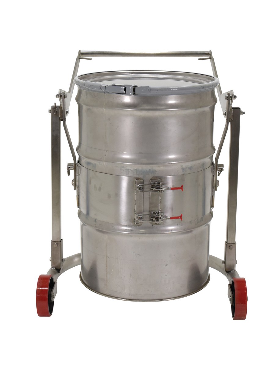 Stainless steel drum carrier/rotator is ideal for raising, transporting, rotating, tilting and draining 55 gallon steel drums. Sturdy handle provides leverage for heavy lifting and easily locks drum in position 5 to 11" off floor. Dual fingertip operated locks secure the raised drum. 304 All stainless steel construction.