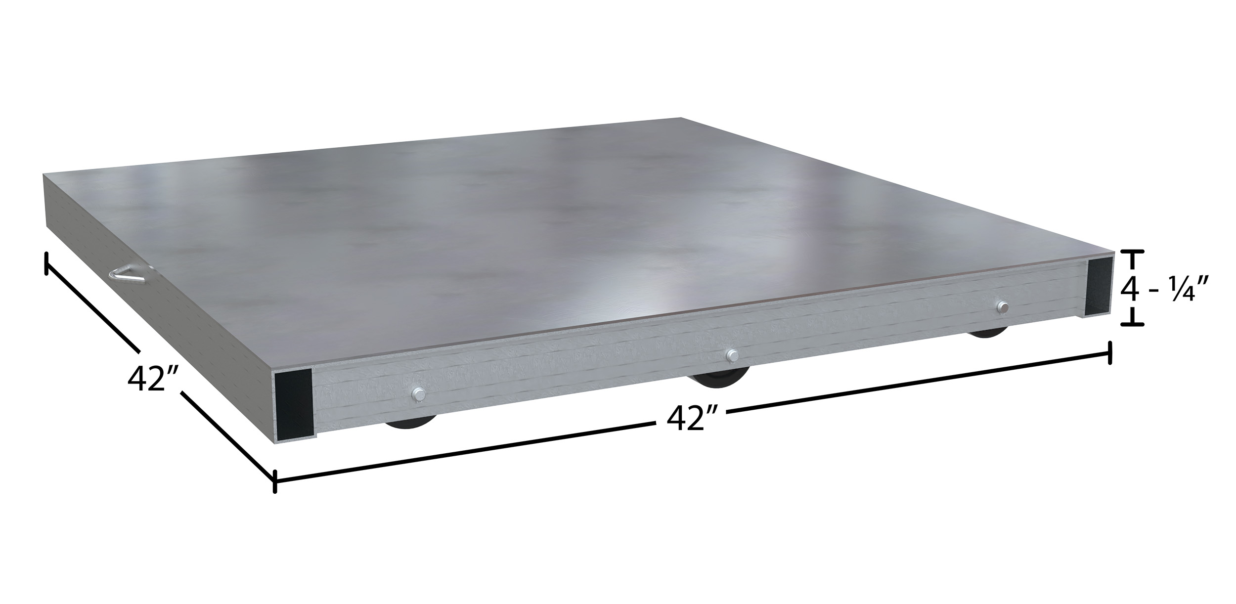 Aluminum Pallet Dolly with Solid Top Tilt 42 In. x 42 In. 4000 Lb. Capacity SilverWhen large or small items need transferred to new areas, let a pallet dolly help. An aluminum pallet dolly is lightweight and has a compact low profile for both handling and storing when not in use. The large capacity allows the user to transfer a wide variety of load sizes. Casters provide a smooth ride when the dolly is loaded and unloaded. The solid top allows for stability and strength during use. Tilting function gives the user the ability to maneuver load to precise positions.