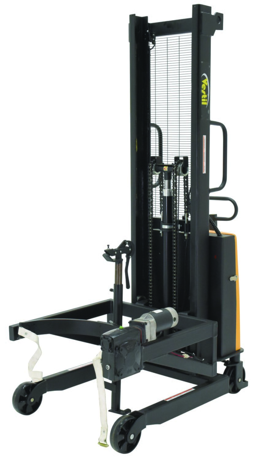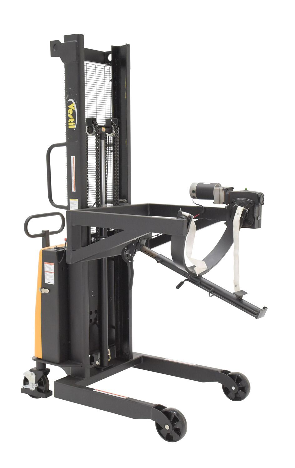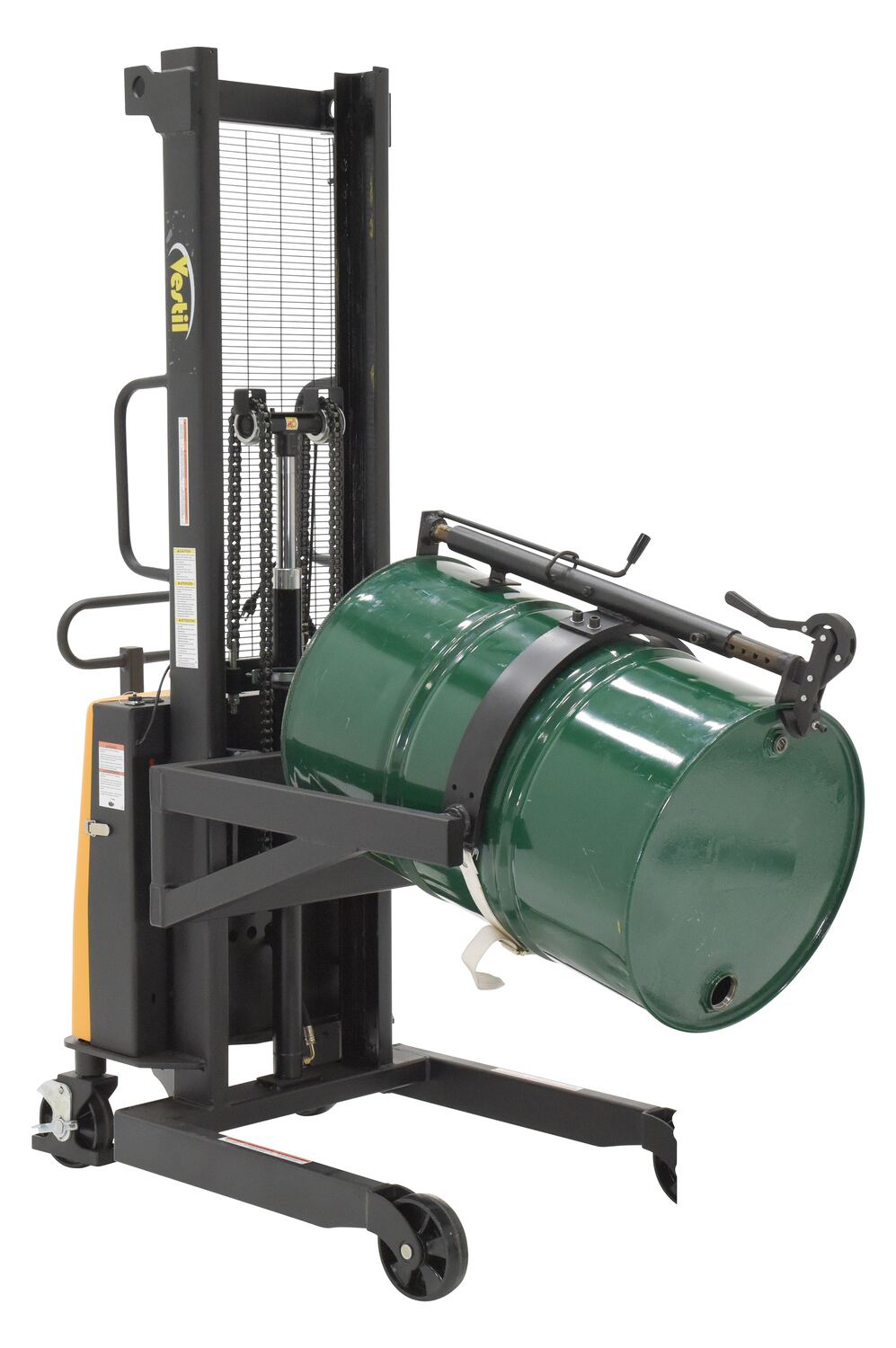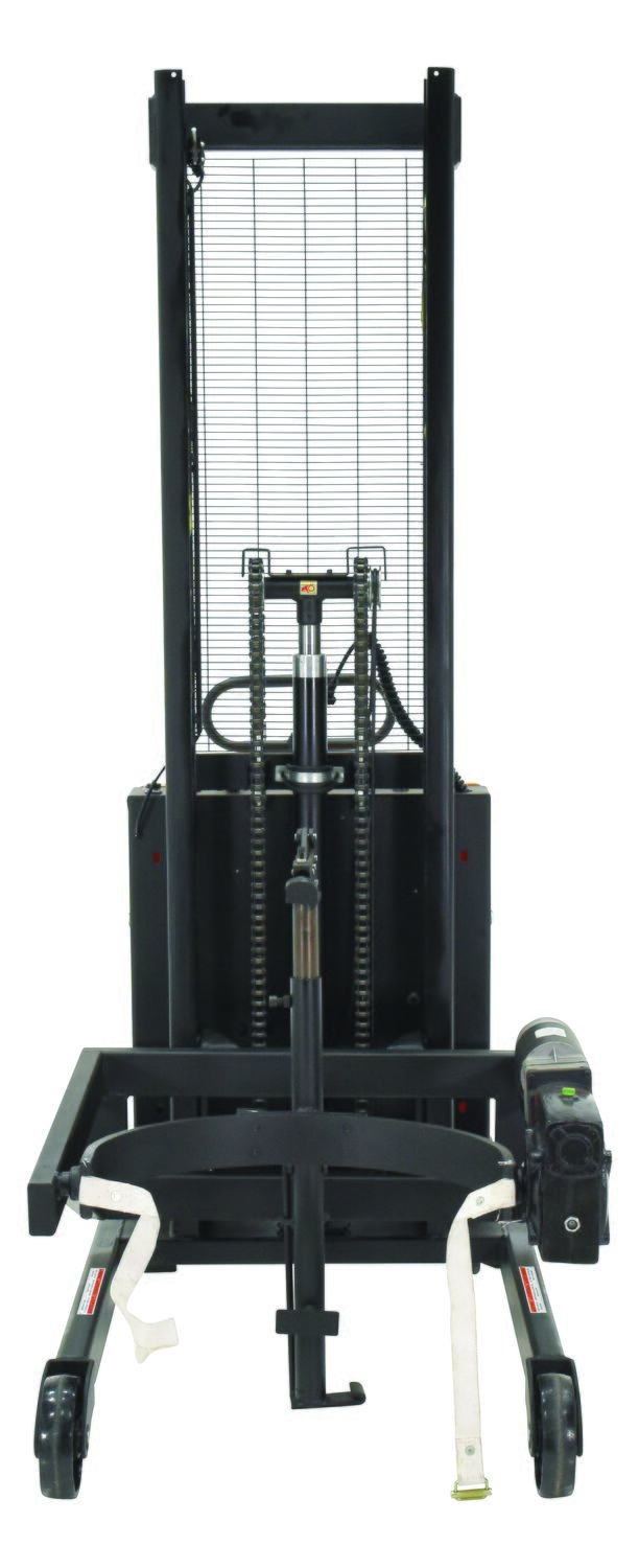 This portable Drum Lifter/rotator/transporter features a DC powered rotation mechanism which provides rotation of the drum. The DC powered mechanism raises and lowers the drum (on-board charger standard). For use with steel and fiber drums.