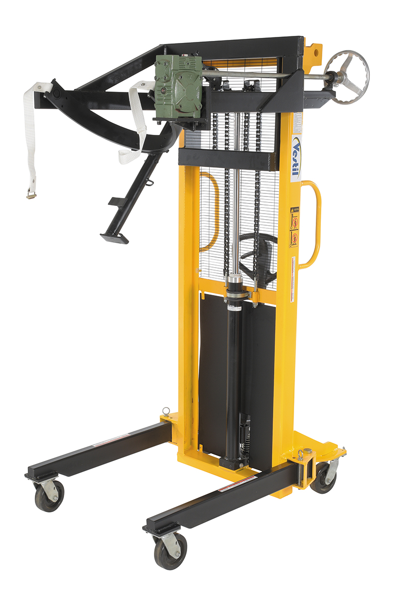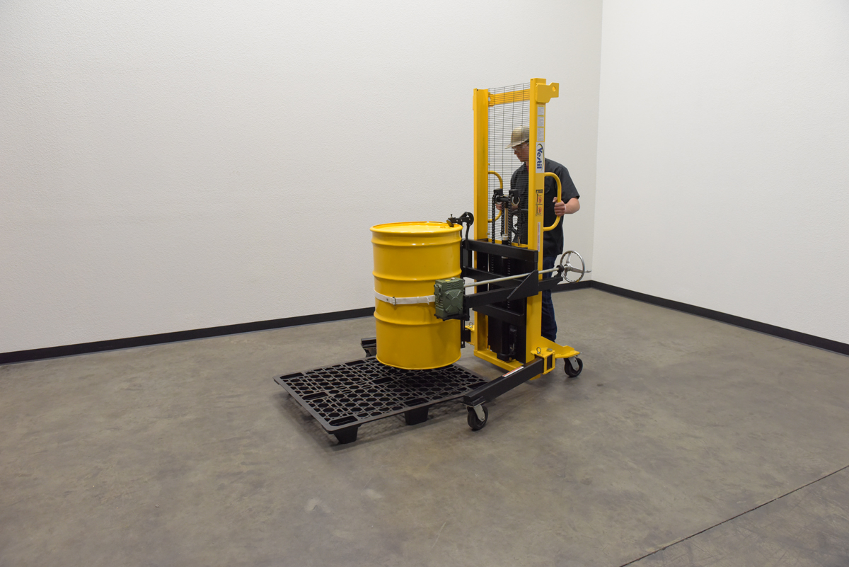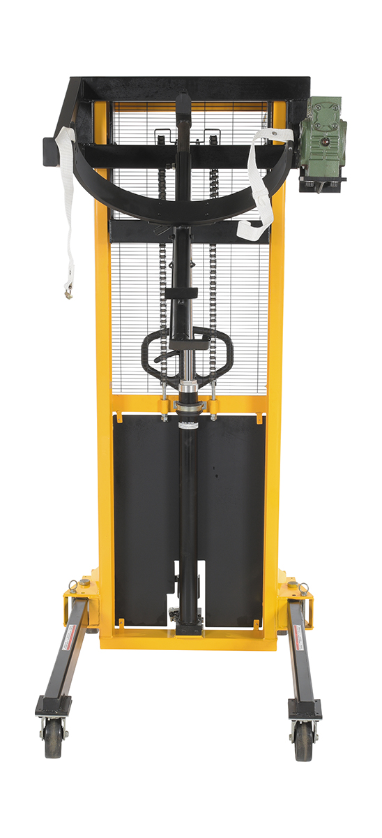 Steel Manual Drum Lifter/Rotator/Transport 51-1/2 In. x 34 In. x 82-5/8 In. 550 Lb. Capacity Yellow/BlackThe manual operation, portable Drum Lifter/rotator/transporter features pivoting straddle legs for access to drums on pallets. Legs will manually pivot and lock into place with locking pin.