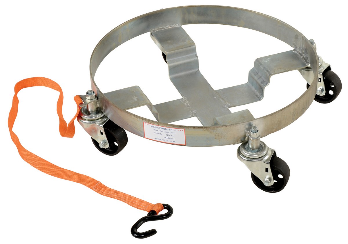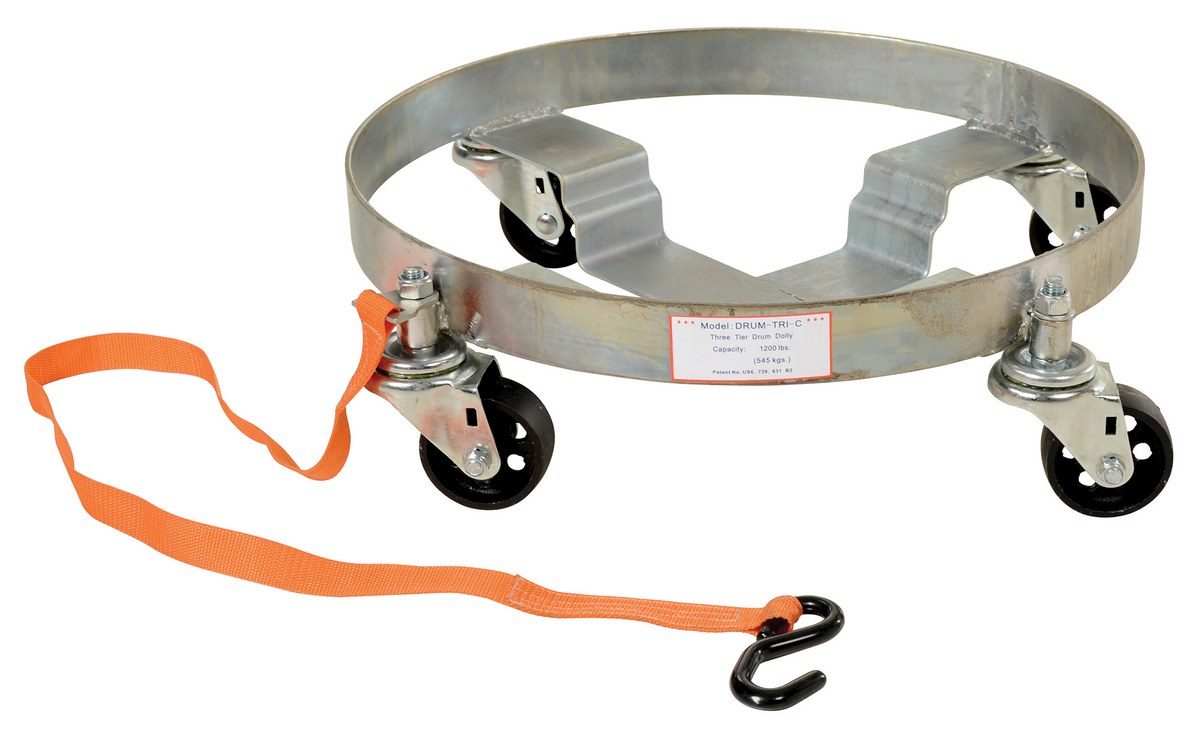 This multi-purpose three-tier drum dolly has a high polished bright zinc finish for corrosion resistance. This dolly comes with a nylon pull strap that helps in transporting down aisles or over thresholds. Rubber-coated hook allows strap to hook on top of drum for storage.