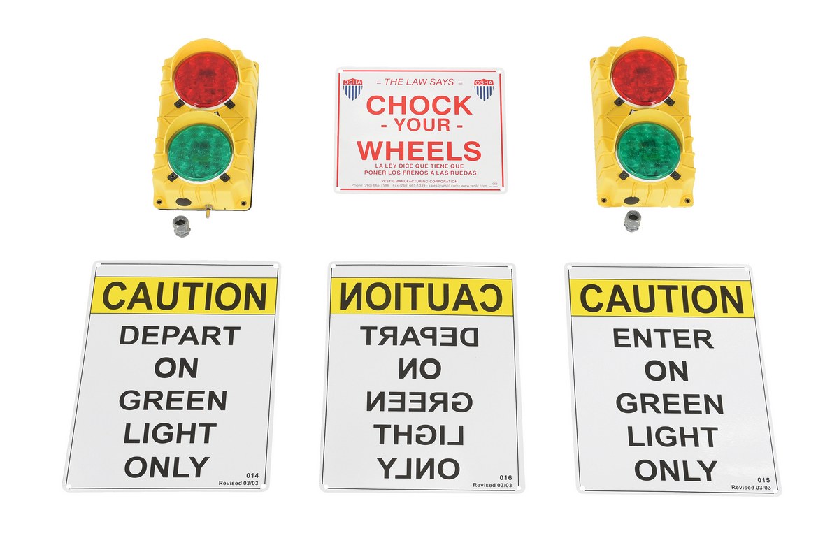 Our dock traffic systems feature flashing red and green lights. Prevent accidents and injuries by providing clear communication between dock personnel and truck drivers. Built-in eyebrow type sun visors increase light visibility. Economy, model DTS-5, comes with two (2) yellow polypropylene traffic lights, 6."W x 11."H, each having a green and a red lens. The light containing a push button is placed inside the dock area for the dock attendant, and the other is placed outside for the truck driver. Four (4) signs are included. LED model never needs bulb replacements.