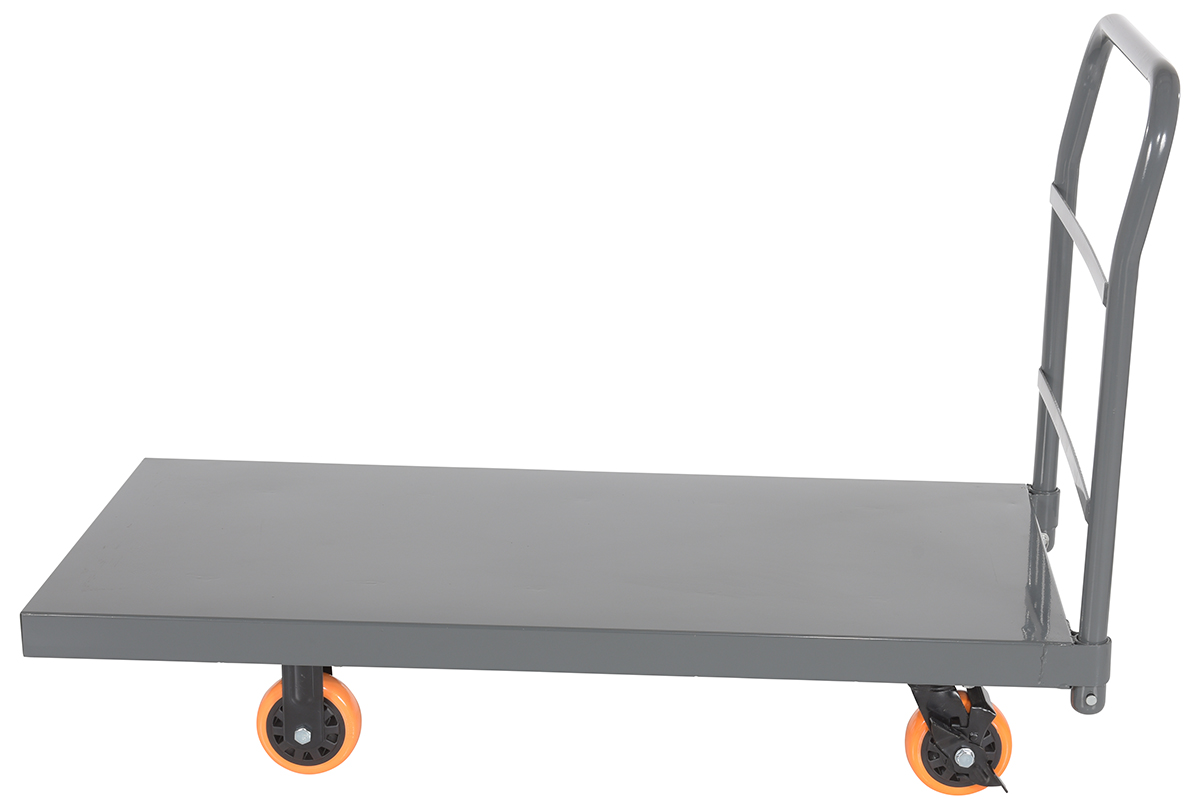 Steel Smooth Deck Platform Truck with 5 In. x 2 In. Poly Casters 45 In. x 45 In. x 39 In. 2500 Lb. Capacity Silver/OrangeThis steel platform truck with a solid, smooth steel deck is all welded and features structural reinforcement underneath for extra strength. It includes one (1) removable high-polished steel handle and rolls smoothly casters. Comes standard with a floor lock.