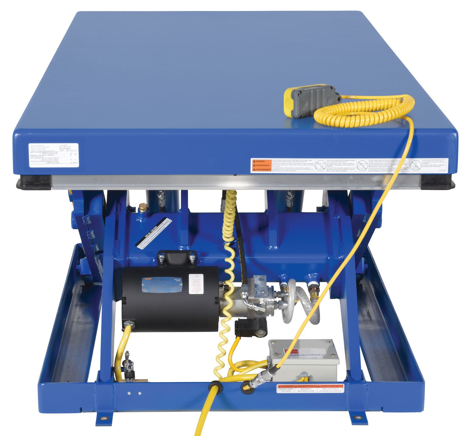 Steel Electric Hydraulic Lift Table 36 In. x 72 In. 8000 Lb. Capacity BlueThe electric hydraulic scissor lift table is used by all types of manufacturing and warehouse facilities. Safety features include a patented pinch point perimeter toe guard to protect pinch points while lowering the table, fused push button control, internal safety velocity fuse to maintain platform height in the event of hose or fitting failure, integral maintenance prop, adjustable upper travel limit switch to stop the table at maximum height, and displacement-style hydraulic cylinders for maximum strength. It also features a pressure plated pump, manifold system, and state-of-the-art lifetime lubricated bearings. The standard 56 frame electric motor is fully enclosed with additional voltage options available. Contact factory if platform dimensions are crucial.