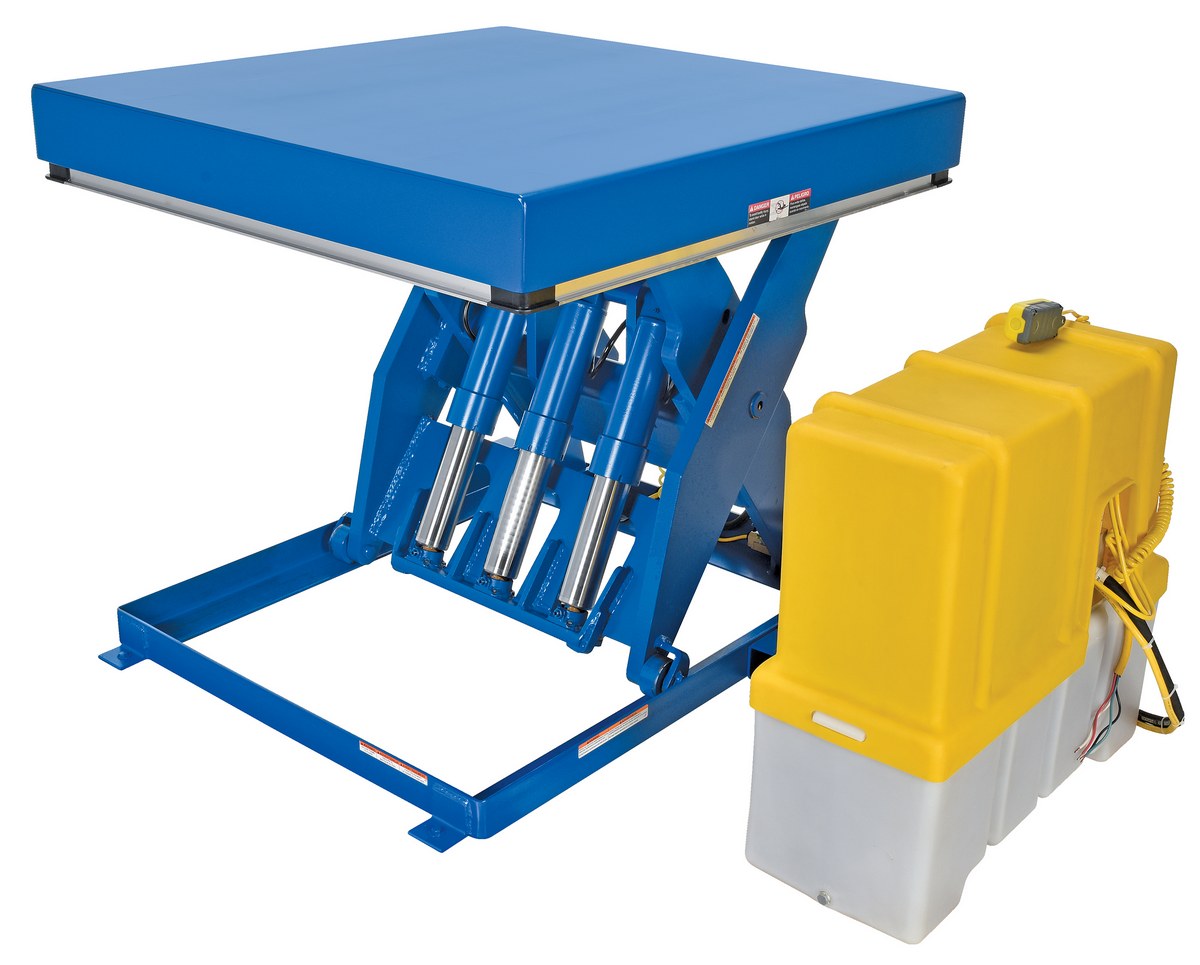 Steel Electric Hydraulic Lift Table 48 In. x 48 In. 12000 Lb. Capacity BlueThe electric hydraulic scissor lift table is used by all types of manufacturing and warehouse facilities. Safety features include a patented pinch point perimeter toe guard to protect pinch points while lowering the table, fused push button control, internal safety velocity fuse to maintain platform height in the event of hose or fitting failure, integral maintenance prop, adjustable upper travel limit switch to stop the table at maximum height, and displacement-style hydraulic cylinders for maximum strength. It also features a pressure plated pump, manifold system, and state-of-the-art lifetime lubricated bearings. The standard 56 frame electric motor is fully enclosed with additional voltage options available. Contact factory if platform dimensions are crucial.