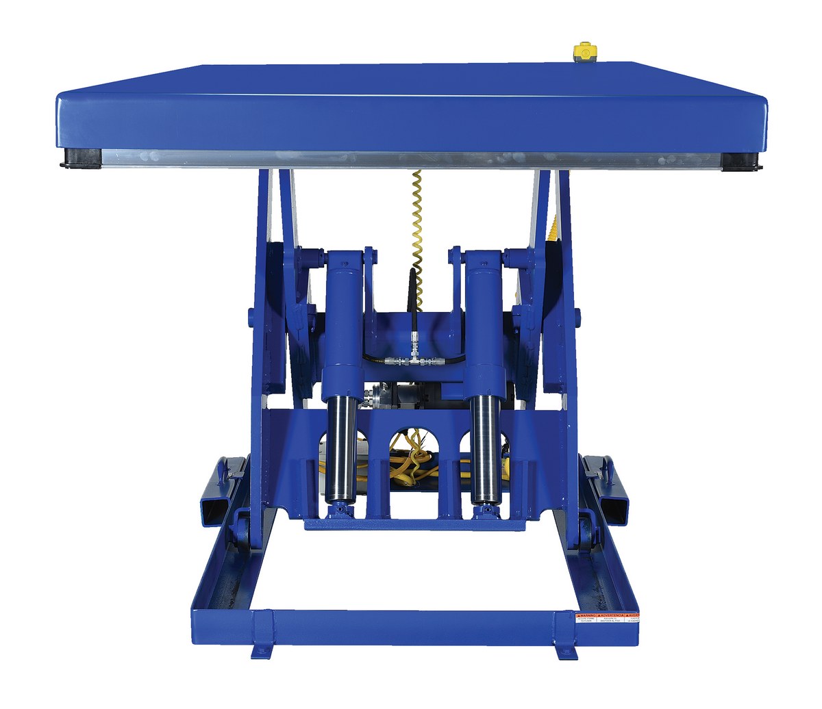 Steel Electric Hydraulic Lift Table 48 In. x 72 In. 6000 Lb. Capacity BlueThe electric hydraulic scissor lift table is used by all types of manufacturing and warehouse facilities. Safety features include a patented pinch point perimeter toe guard to protect pinch points while lowering the table, fused push button control, internal safety velocity fuse to maintain platform height in the event of hose or fitting failure, integral maintenance prop, adjustable upper travel limit switch to stop the table at maximum height, and displacement-style hydraulic cylinders for maximum strength. It also features a pressure plated pump, manifold system, and state-of-the-art lifetime lubricated bearings. The standard 56 frame electric motor is fully enclosed with additional voltage options available. Contact factory if platform dimensions are crucial.