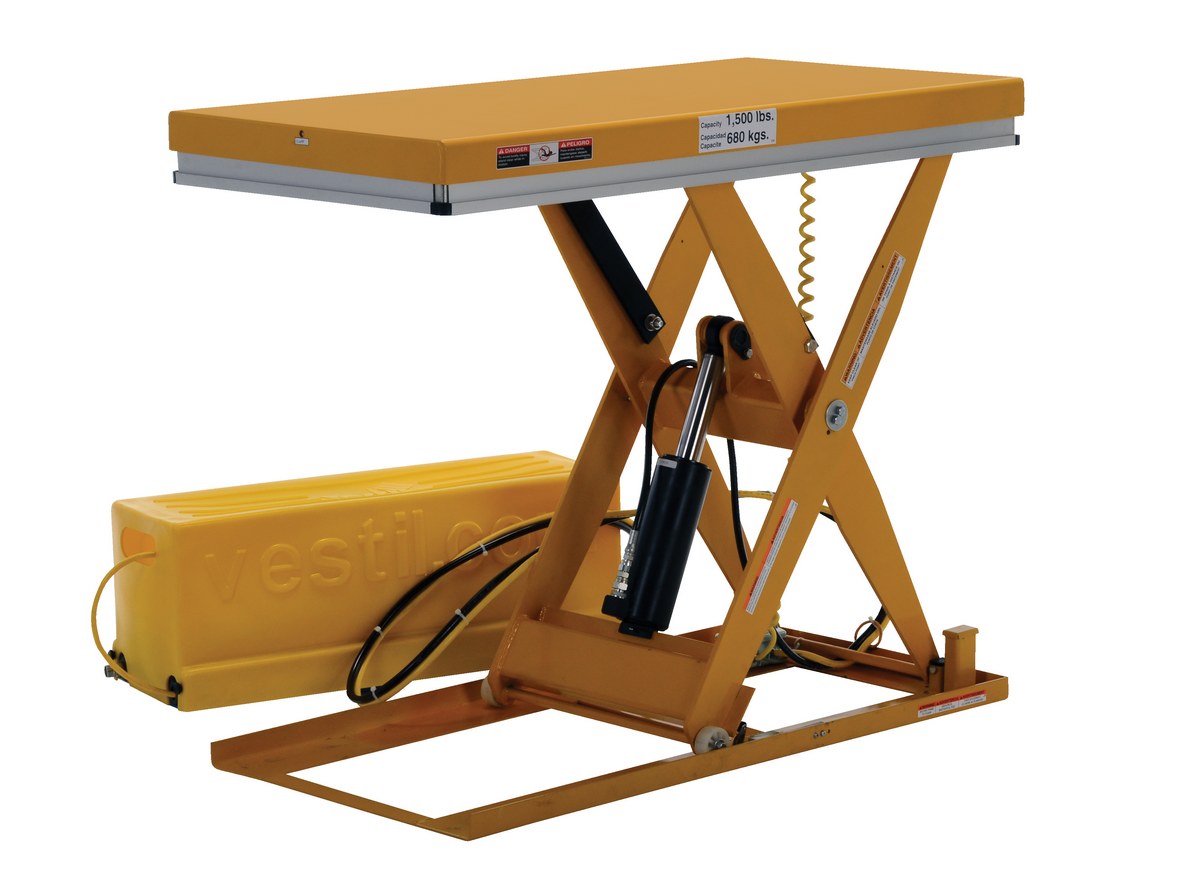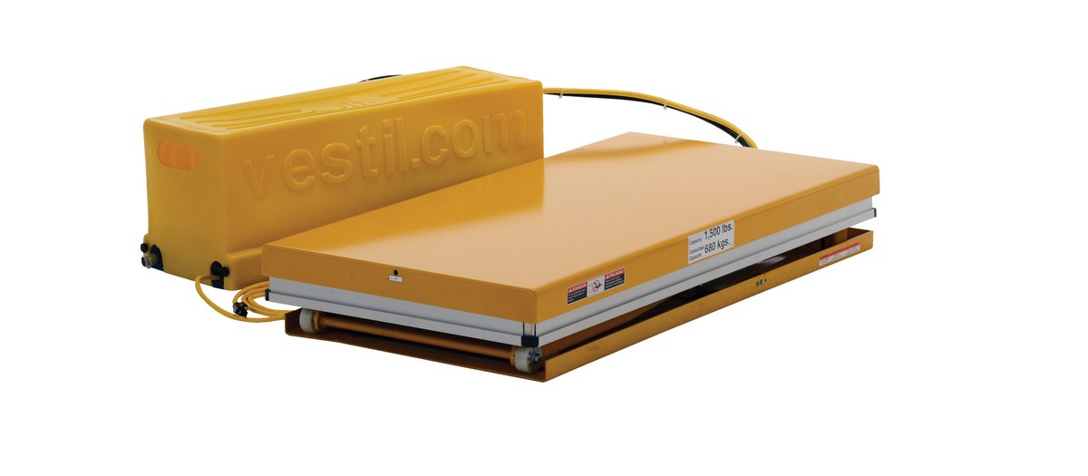 The work station electric hydraulic scissor table is designed to raise products up to an ergonomic working height. It maximizes safety with minimum space requirements and is ideal for all types of manufacturing and warehouse facilities. The external power unit can be located eight (8) feet away from the unit and comes with a standard hand control. An electric toe guard also comes standard with the unit.