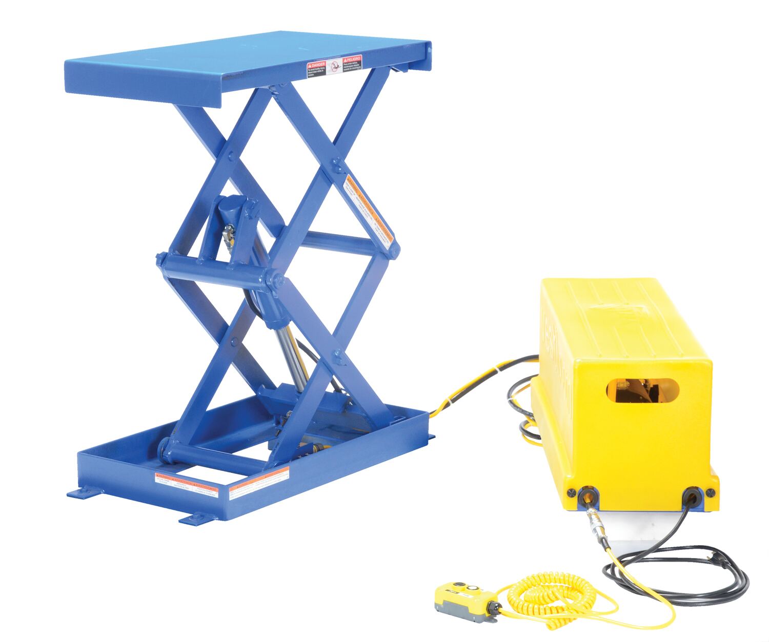 Steel Double Leg Shorty Scissor Lift Table 16 In. x 28 In. 1000 Lb. Capacity BlueBuilt with the same quality as all our lift tables, the unit maximizes safety and durability. Designed to raise products up to an ergonomic working height. When tight spaces are what you have, consider a shorty scissor table. Available in both a single and double leg styles these tables offer smaller deck sizes customized to your space requirements. Design features includes full perimeter pinch point guard and emergency internal safety velocity fuse. External power unit and hand control is standard.