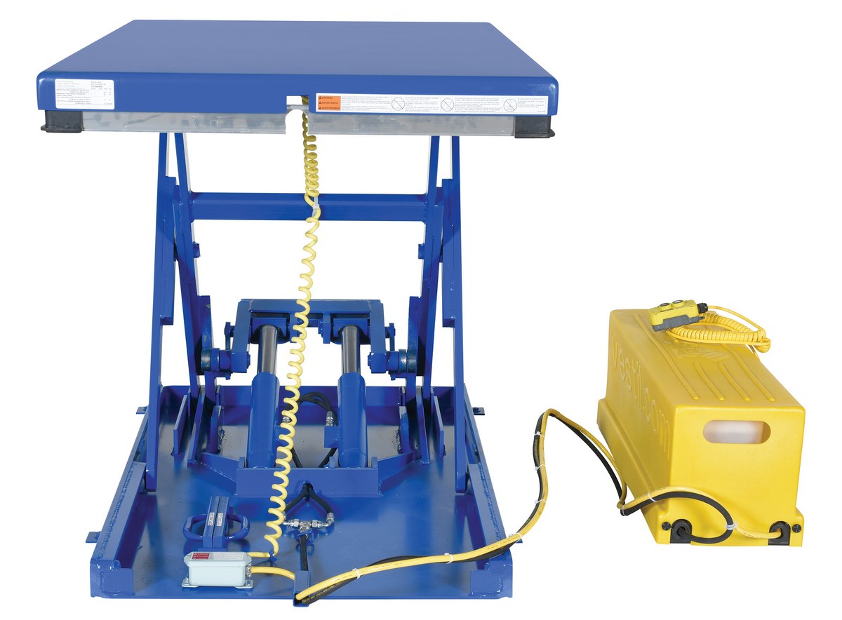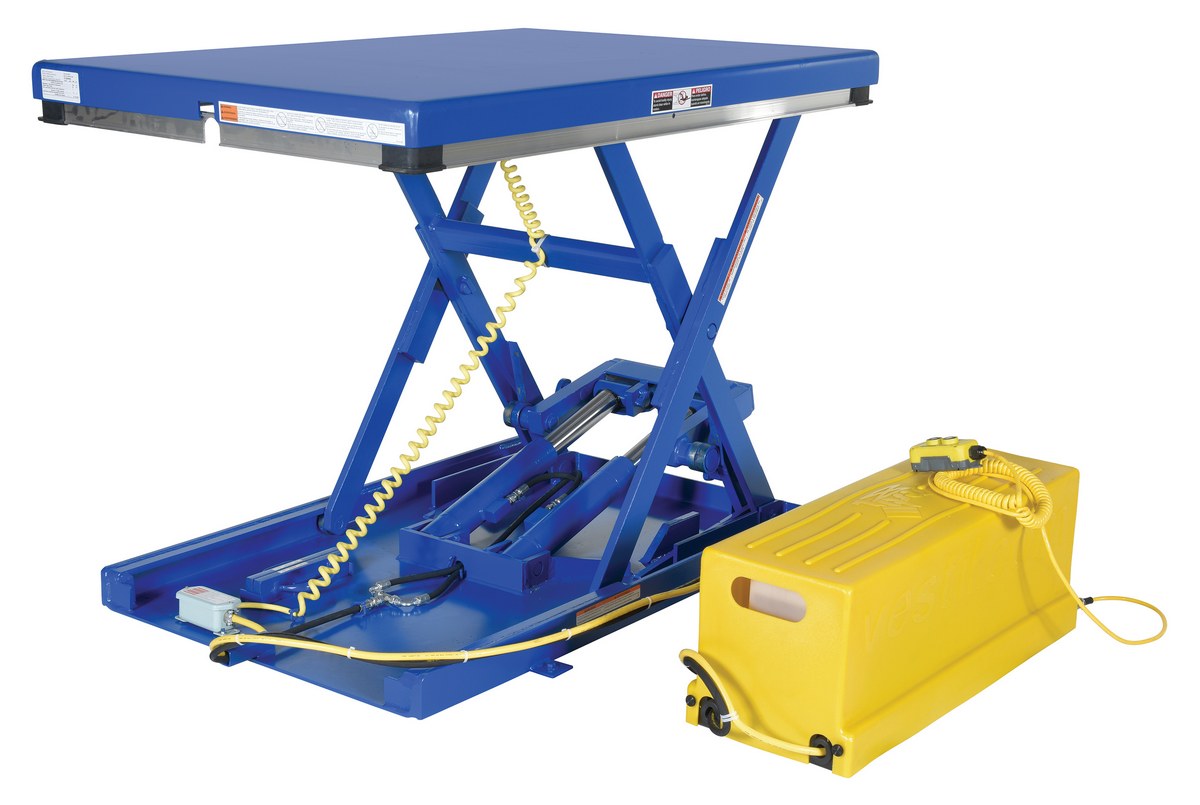 The low profile electric/hydraulic scissor lift table loads and unloads skids with a pallet truck without the need for a pit when using the optional approach ramp. The superior engineering features rugged durability with safety features that include an electric perimeter pinch point guard, emergency stop velocity fuse in cylinders, handheld control and maintenance supports. The remote power unit comes complete with a plastic cover to protect the motor from dust and debris.