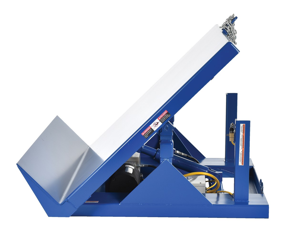 Steel Efficiency Master Tilt Table 48 In. x 48 In. 4000 Lb. Capacity BlueThe efficiency master tilt table tilts pallets, crates, boxes, or baskets to facilitate easy container loading or unloading. The table features all welded steel construction for years of durability. The unique design minimizes pinch points to meet OSHA requirements. This tilt table is equipped with an industrial quality motor that delivers the best torque with minimal amperage draw for maximum life. Standard voltage is 460/3PH, with additional voltage options available. The tilt table has a standard push button hand control. Base includes fork pockets for portability with forklift.