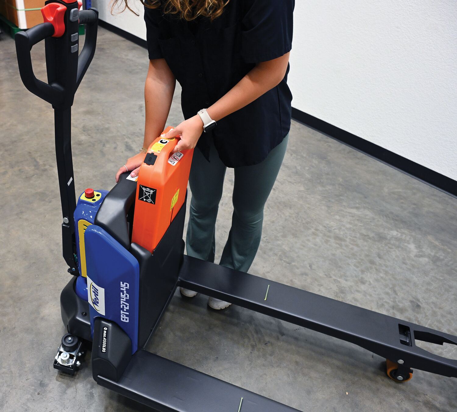 Steel Electric Pallet Truck 27 In x 45 In 4,500 Lb. Capacity Black/BlueAn electric pallet truck is the perfect upgrade from the standard manual design. This functional approach minimizes manual labor and maximizes efficiency when moving products and goods. Speed adjustments as well as raising/lowering forks can be modified without the users' hands leaving the functional handle. Unit is powered by a lithium ion battery for continuous consistent use. Forks are powder coated for a baked in added toughness. Horn is also included.