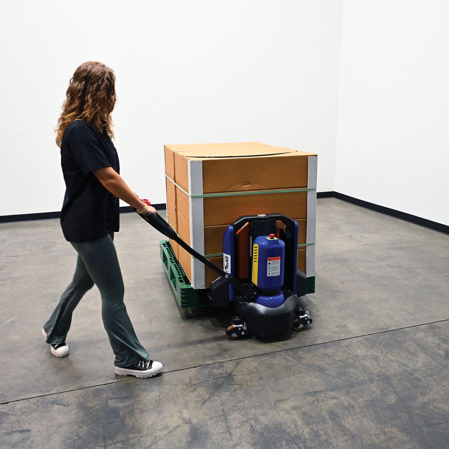 An electric pallet truck is the perfect upgrade from the standard manual design. This functional approach minimizes manual labor and maximizes efficiency when moving products and goods. Speed adjustments as well as raising/lowering forks can be modified without the users' hands leaving the functional handle. Unit is powered by a lithium ion battery for continuous consistent use. Forks are powder coated for a baked in added toughness. Horn is also included.