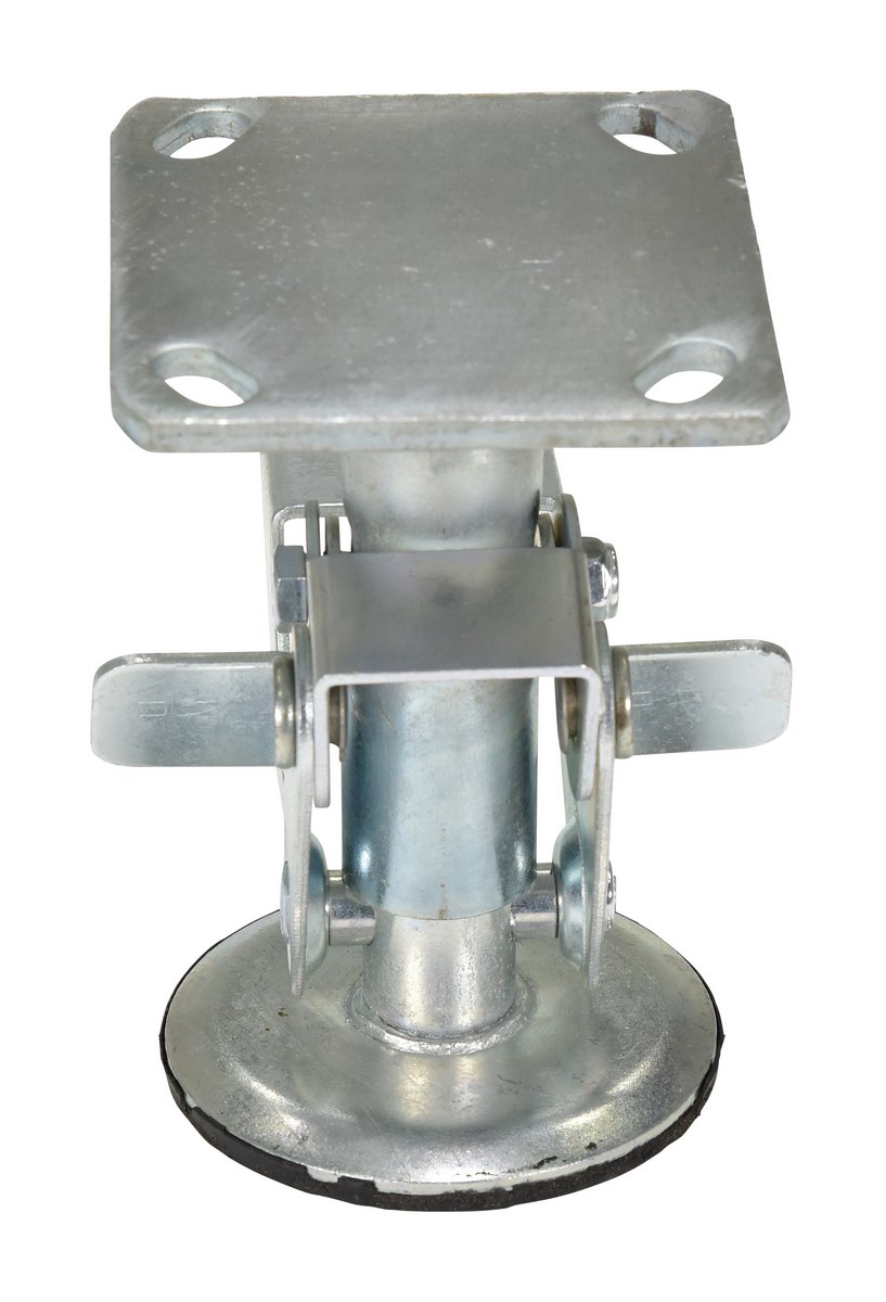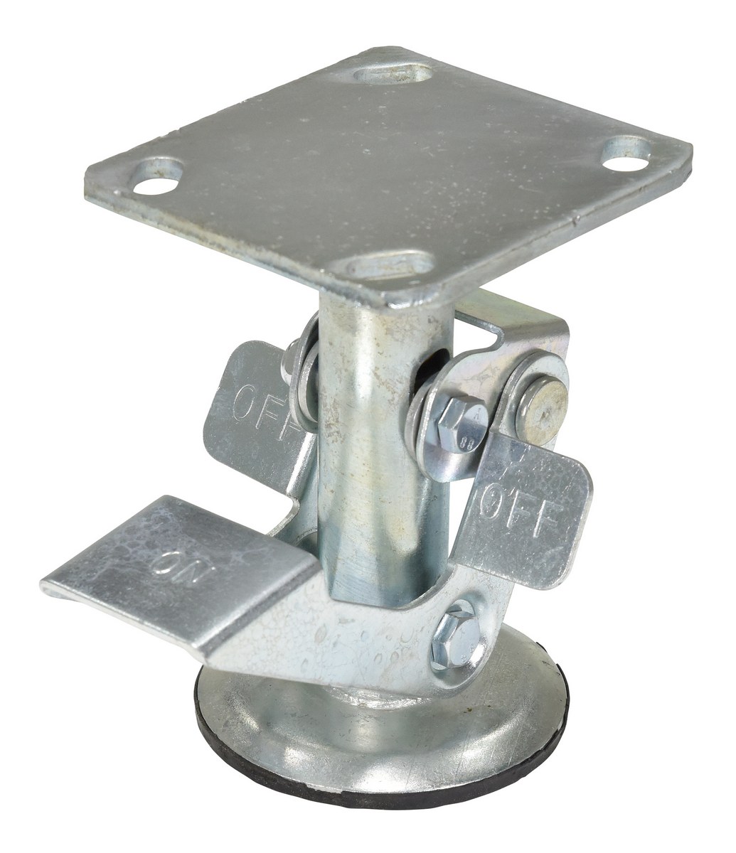 Steel Top Mount Floor Lock 6 to 7 In. Height SilverFloor locks may be used on platform trucks, fixture dollies, or equipment with casters. Simple foot pressure immobilizes equipment. Locks when large friction face is pressed against the floor. To release simply kick release rod. Brake is independent of casters and can be installed to any convenient location on the cart. Vertical mounting plate designed to mount to sides of carts and other portable products. The spring loaded pad accommodates uneven floors. Units mount with pad 1." off the floor when retracted.