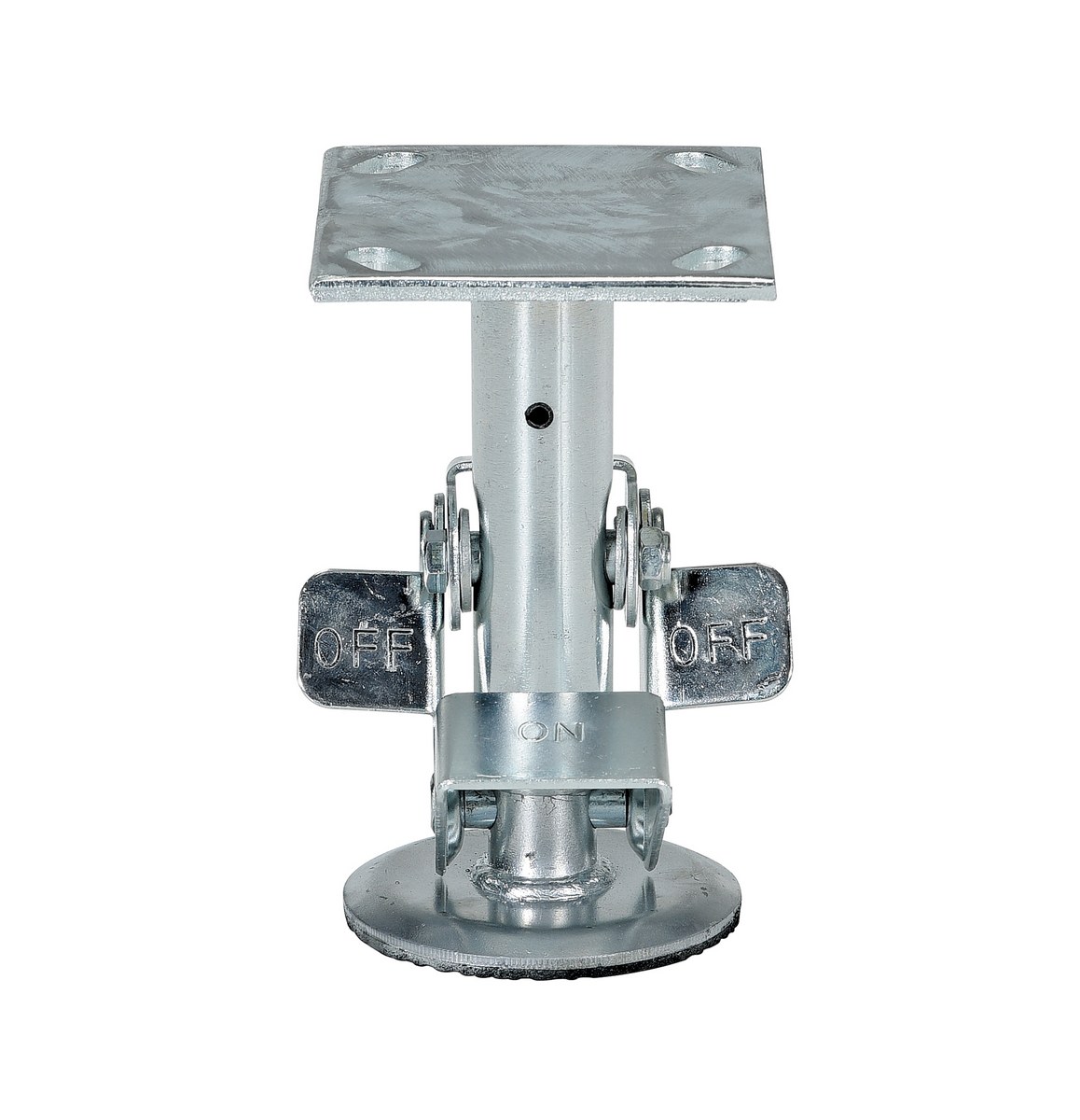 Galvanized Steel Top Mount Floor Lock 6-1/2 to 7-1/4 In. Height GrayFloor locks may be used on platform trucks, fixture dollies, or equipment with casters. Simple foot pressure immobilizes equipment. Locks when large friction face is pressed against the floor. To release simply kick release rod. Brake is independent of casters and can be installed to any convenient location on the cart. Vertical mounting plate designed to mount to sides of carts and other portable products. The spring loaded pad accommodates uneven floors. Units mount with pad 1." off the floor when retracted.