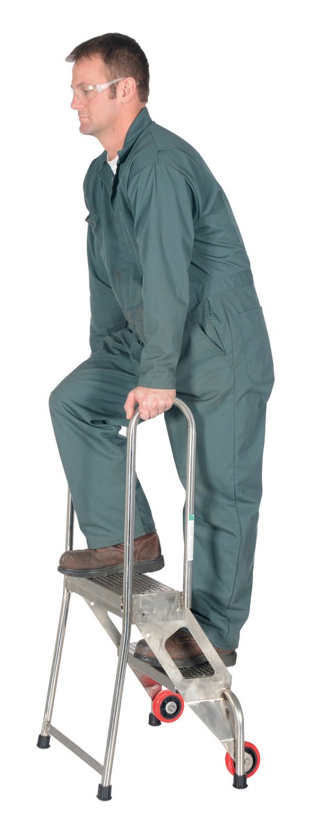 The folding ladder with wheels has a locking foldable design that saves on storage space when ladder is not in use. Ladder folds after unlocking spring-loaded detent pin. Once unit is folded, tilt back on wheels for easy portability. Ladder is carbon steel. The steps are perforated to provide a non-slip surface.