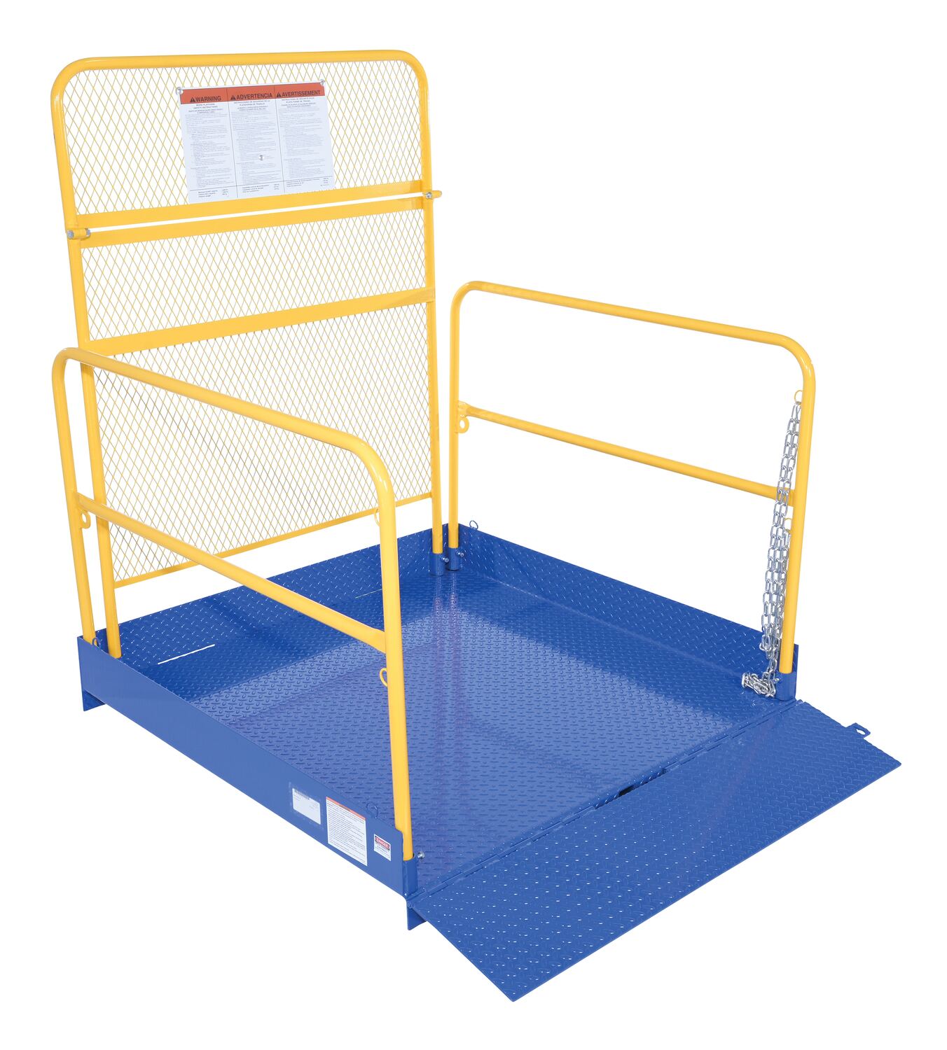 Steel Economical Portable Loading Platform with Handrails 54 In. x 54 In. 2000 Lb. Capacity BlueThis loading platform for fork trucks allows fork trucks to load/unload items into trucks and trailers. Maximum uniform weight capacity is dependent on fork truck capacity. Includes fold-down lip to help with transition. Side guard toe boards. Four (4) tie-down rings are included for securing equipment (tie downs not included). Diamond tread plate floor for extra traction. Handrails on two (2) sides, back mesh screen and chain to secure open end. safety strap (included) to secure platform to fork truck. Steel construction with blue baked-in powder-coated toughness.