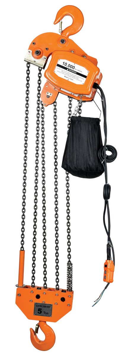 Steel Economy Chain Hoist with Chain Container 1 Phase 10000 Lb. Capacity OrangeThis compact hoist features a high efficiency motor with convenient push-button operation. Single phase power available. Unit is dust and water resistant, load limit fitted. Chain container included.