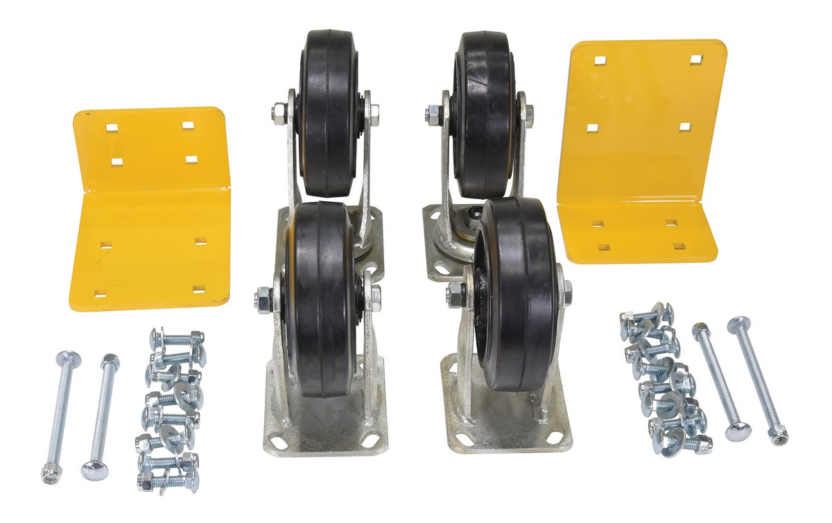 Casters for the self-dumping hoppers create a more worthwhile portable unit. Casters are constructed of glass filled nylon for strength and durability throughout a lifetime of use. The high capacity allows the simple transport of heavy loads promoting task efficiency. Casters are bolted-on by utilizing the factory stamped hole in the fork tubes.