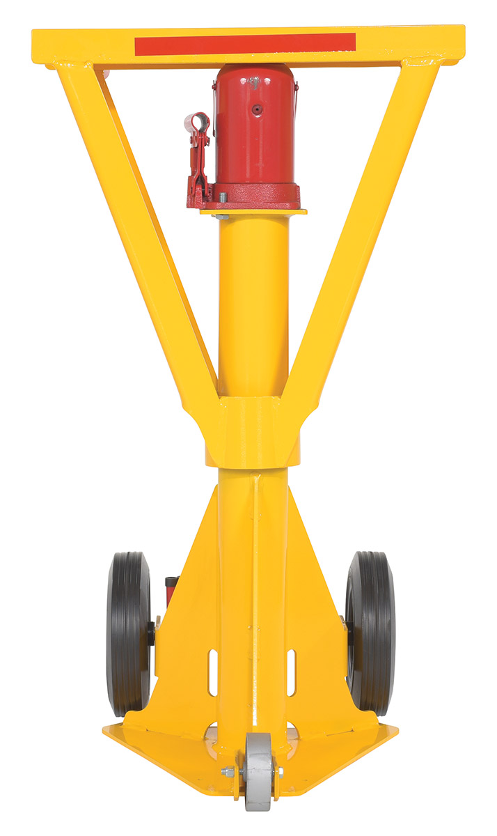 Trailer stabilizing jacks are used to prevent up-ending of semi-trailers when they are not connected to a tractor during loading and unloading operations. Throughout the loading and unloading process it is always recommended to use two jacks, one on each side of the front of the trailer. The trailer must be situated on a flat, stable and improved (preferably concrete) surface, while the jack sits perpendicular to the underside of the trailer. Every jack is built of a high strength steel construction with a flush-type Zerk fitting for lubricating ACME screw. A yellow powder coat finish and a reflective collar for visibility at night are both included. Each jack meets OSHA regulations when used with wheel chocks. **The color of handles included with models may vary between red and black**.