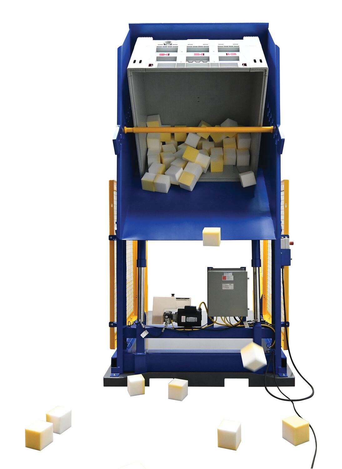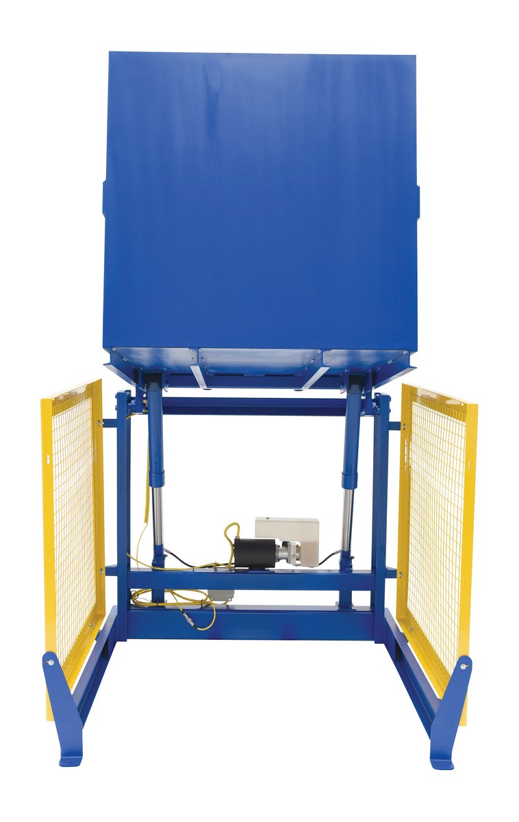 The electric/Hydraulic box dumper is designed for controlled dumping of material from boxes, crates, and other types of containers. It is designed for pallet truck loading and unloading. The retaining bar adjusts to accommodate a wide range of container heights. Each dump height has a hold down range and an internal power unit with a hand held control standard. It has a heavy-duty welded steel construction with protective mesh side screens included.