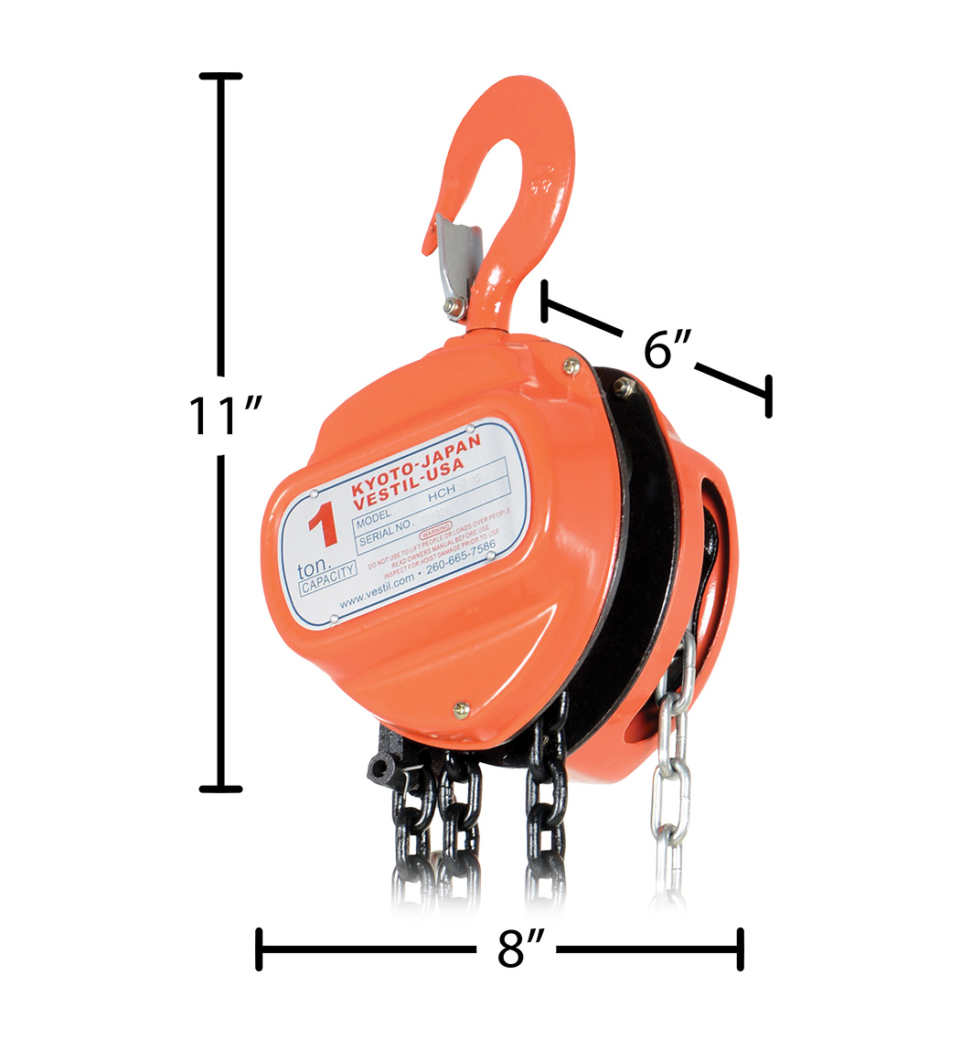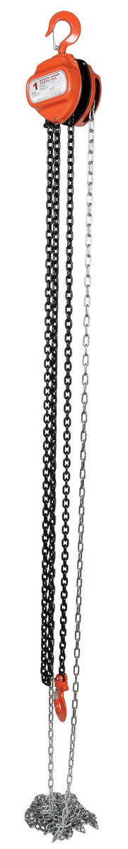 This portable, lightweight hand Chain Hoist is durable and easy to operate. Compact design and low headroom allow installation in confined areas. Enclosed double ratchet pawls with self adjusting disc brake standard. Designed with a safety factory four (4) times rated capacity. Individually tested at 150% rated capacity. Features black chain tempered to ISO 3077, pull chain, hardened two-stage gears and forged steel upper and lower hooks with safety latches. Constructed of high quality steel components ideal for industrial applications.
