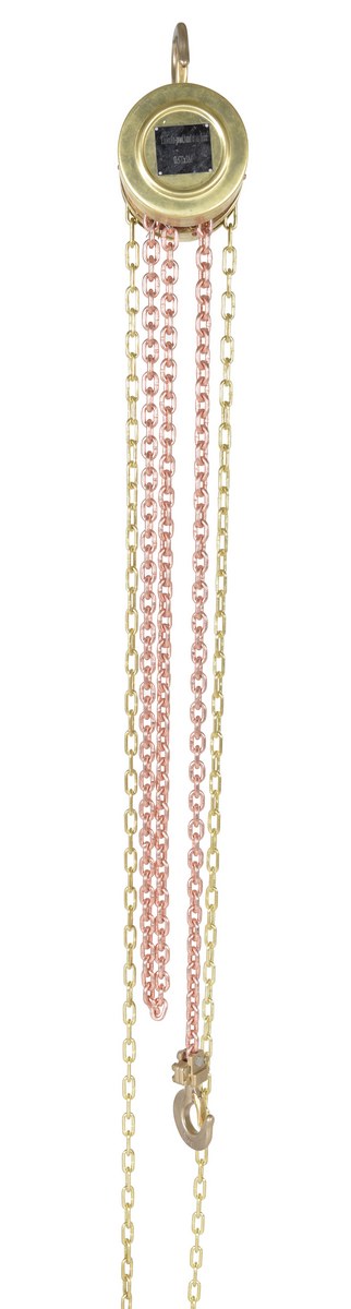 Non-sparking brass construction. Brake engages automatically as soon as the hand chain stops moving. Forged load hooks. Low gear ratio reduces effort required for lifting. Satisfies relevant ANSI B30.16-2003 requirements.