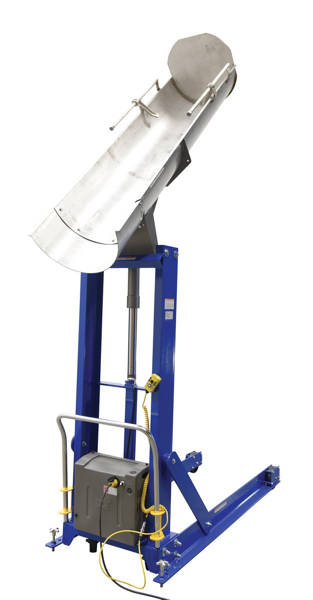 The Hydraulic drum dumper is what you need to dump heavy drums. Works with plastic, steel, and fiber drums. Dumper has a solid steel chute. this portable unit has casters with floor lock screws. All steel construction. Upper travel limit switch, emergency brass safety velocity fuse in cylinder, and vertical adjustment drum restraints are standard. Dumper is operated with a hand held control on a coil cord standard.