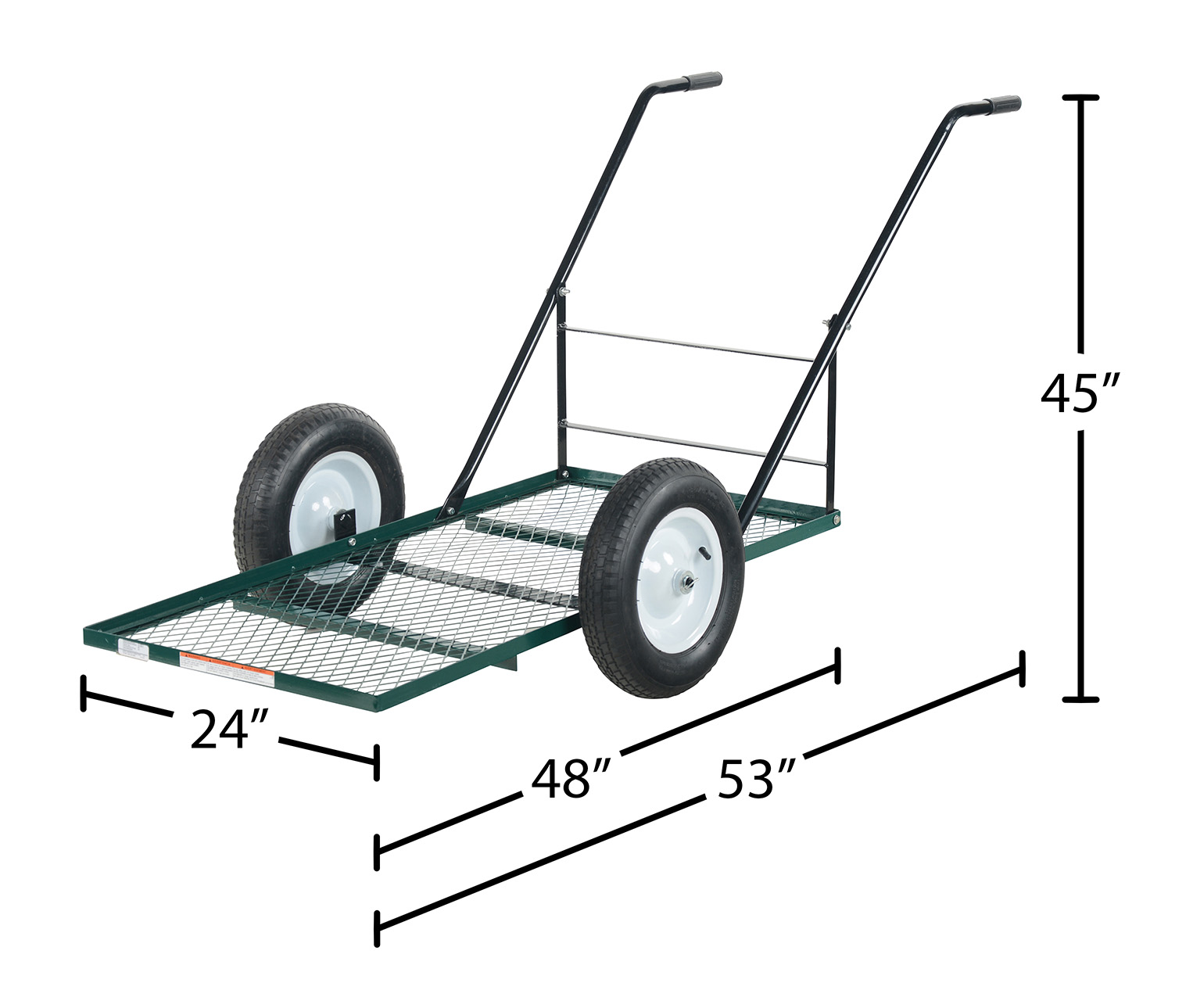 Steel Landscape Cart with Low Profile Tilt 53 In. x 24 In. x 45 In. 500 Lb. Capacity GreenTransport plants, flowers, trees, shrubs, rocks, and similar materials or parts with this landscape, nursery & agriculture cart. The cart is rugged and easy to maneuver with their large pneumatic tires. This cart has mesh sides and bottoms to allow dirt, small rocks, and water to drain through.