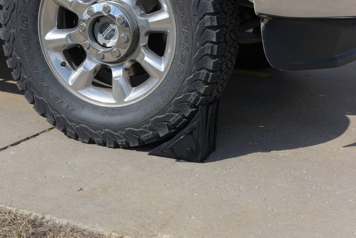 The rubber Wheel Chock is constructed of reinforced rubber to provide a sure grip on virtually any surface. The curved surface contours to fit tires. Rubber resists tearing, abrasion, ozone weathering, etc. The functional design is durable in all weather conditions.