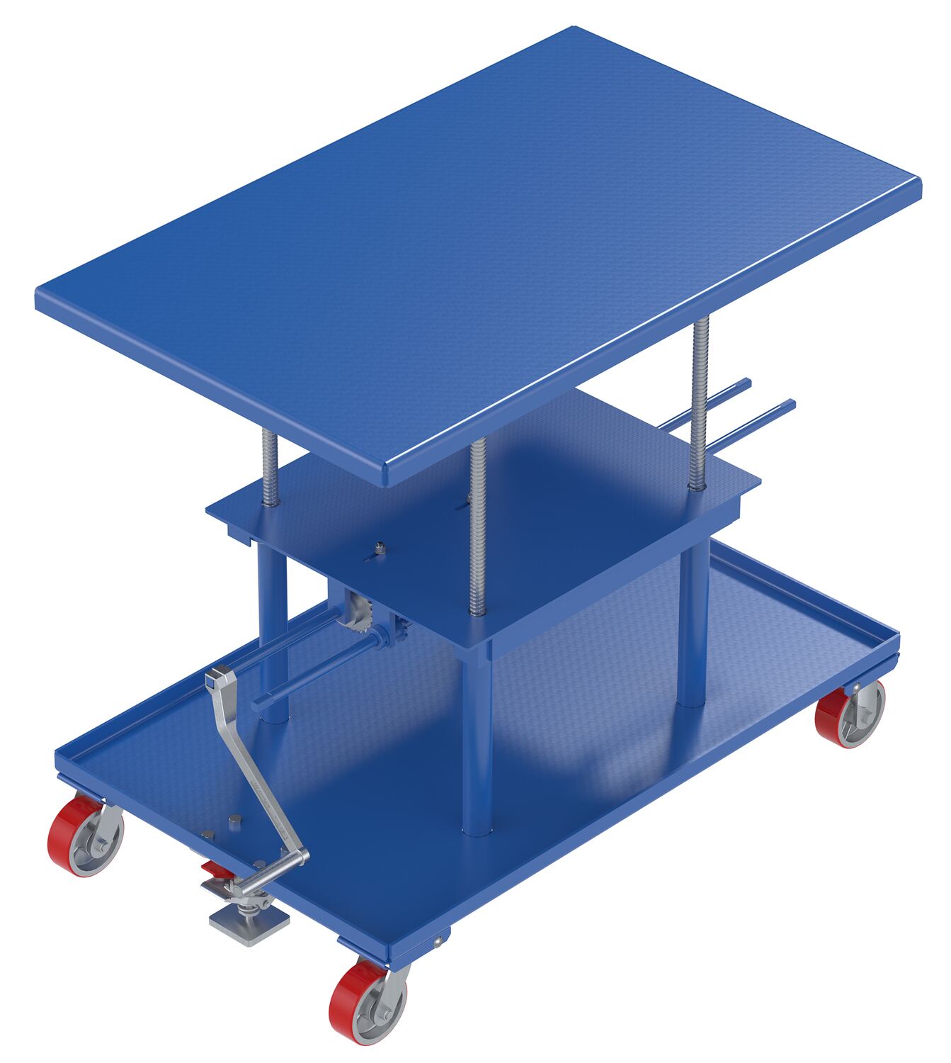 The mechanical post table is an adjustable portable table that is well suited for a wide variety of material handling applications. It moves smoothly on two rigid and two swivel poly-on-steel casters. Includes bolted on adjustable floor lock. Provides positive height adjustment without a downward shift. It features a two-speed manual gear mechanism to move heavy loads.