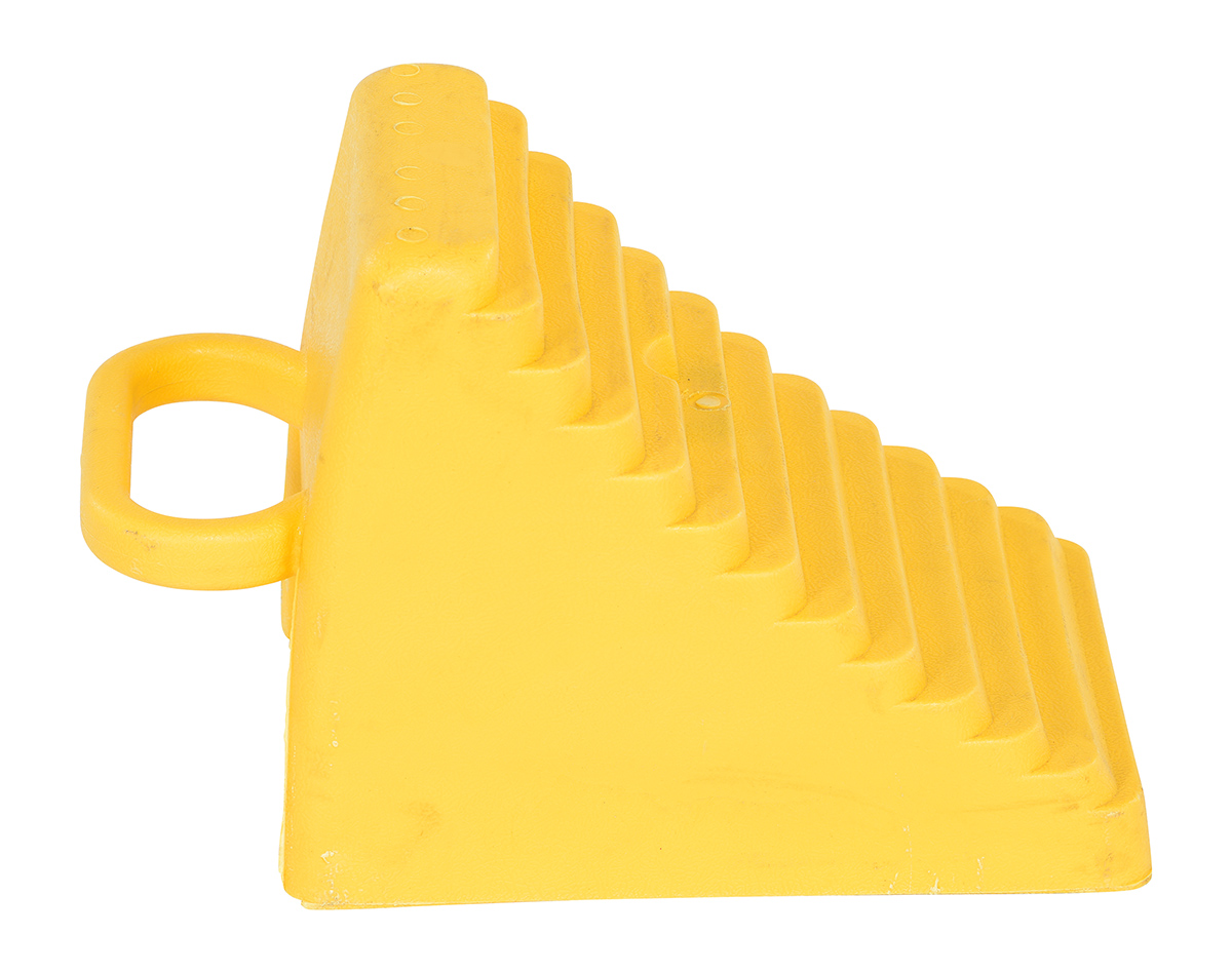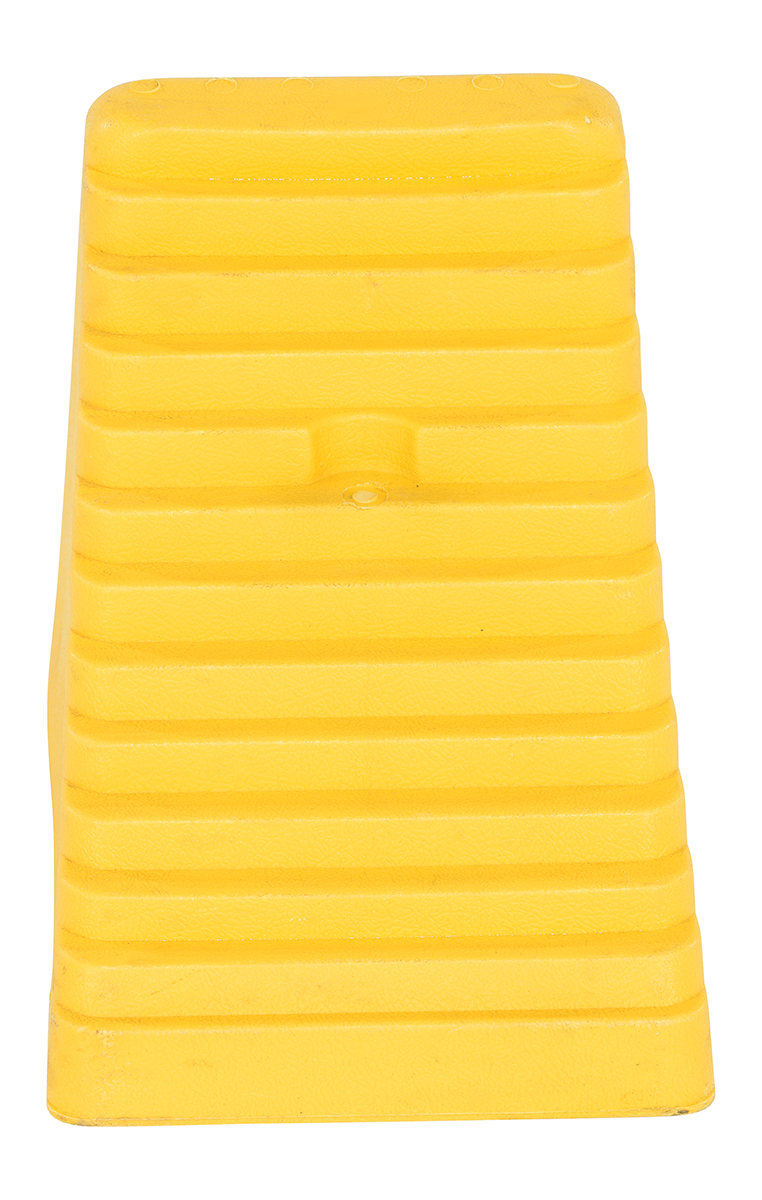 A polyethylene wheel chock helps maintain stability on uncertain surfaces. With a steady foundation, the chocks minimize the chance of movement or jostling. A lightweight design is perfect for carrying and transference from areas to area. With a bright design, the color promotes clear visibility. The chock is compact in size for minimal storage space when not in use.