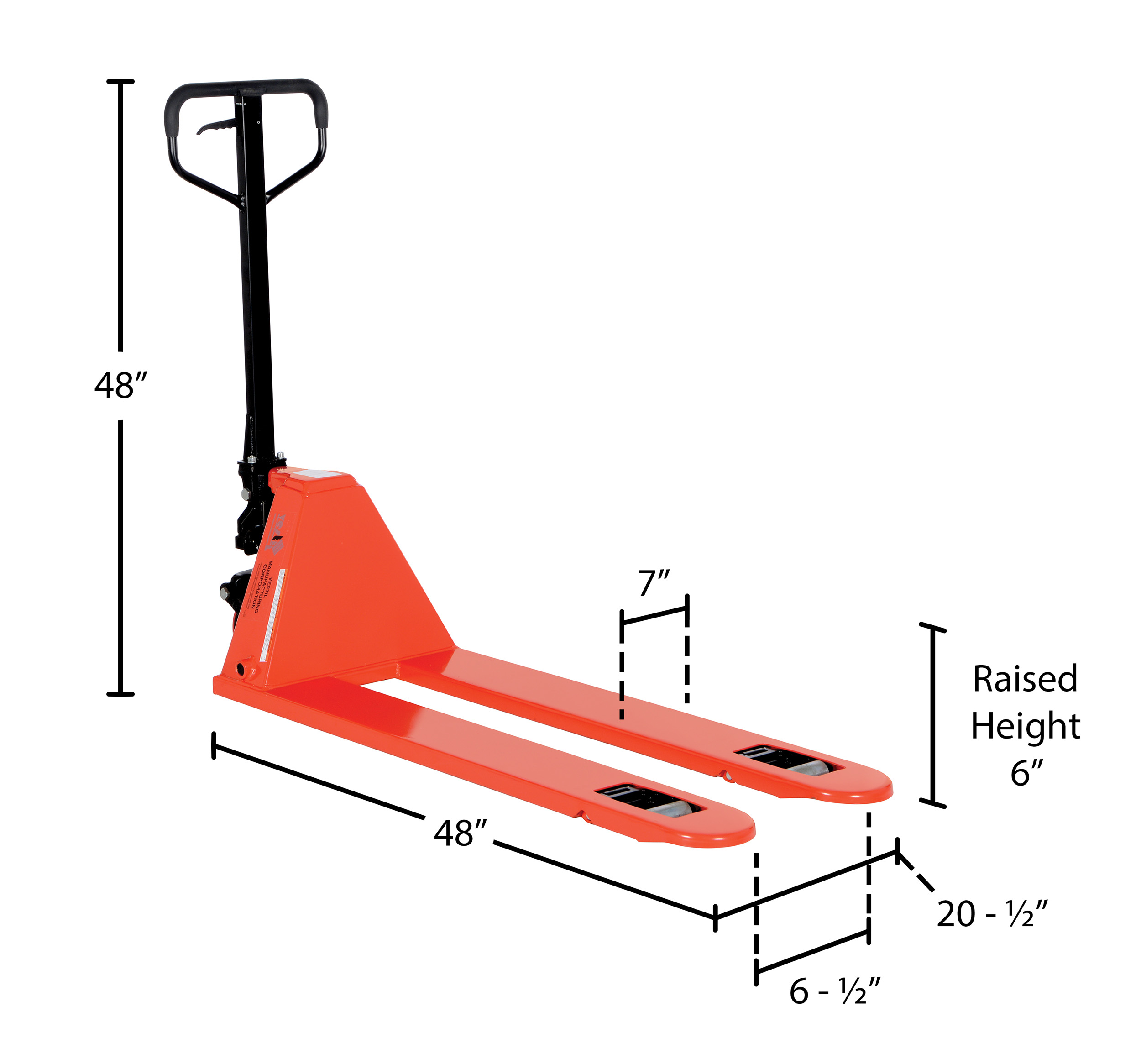 Steel Low Profile Pallet Truck 61 In. x 20-1/2 In. x 49 In. 4000 Lb. Capacity RedThe Low Profile pallet truck can enter a pallet from all four sides. The all steel frame is reinforced to handle heavy loads. Wide loop handle control with lift, neutral, and lower functions provides fingertip control. The unit has lifetime lubricated bearings and a hydraulic system that has a hard chrome plated pump piston with polyurethane seals. The suspension system has heavy-duty thrust bearing. This pallet truck comes complete with adjustable push rods, polyurethane wheels, steel load rollers, and a red powder coat finish.